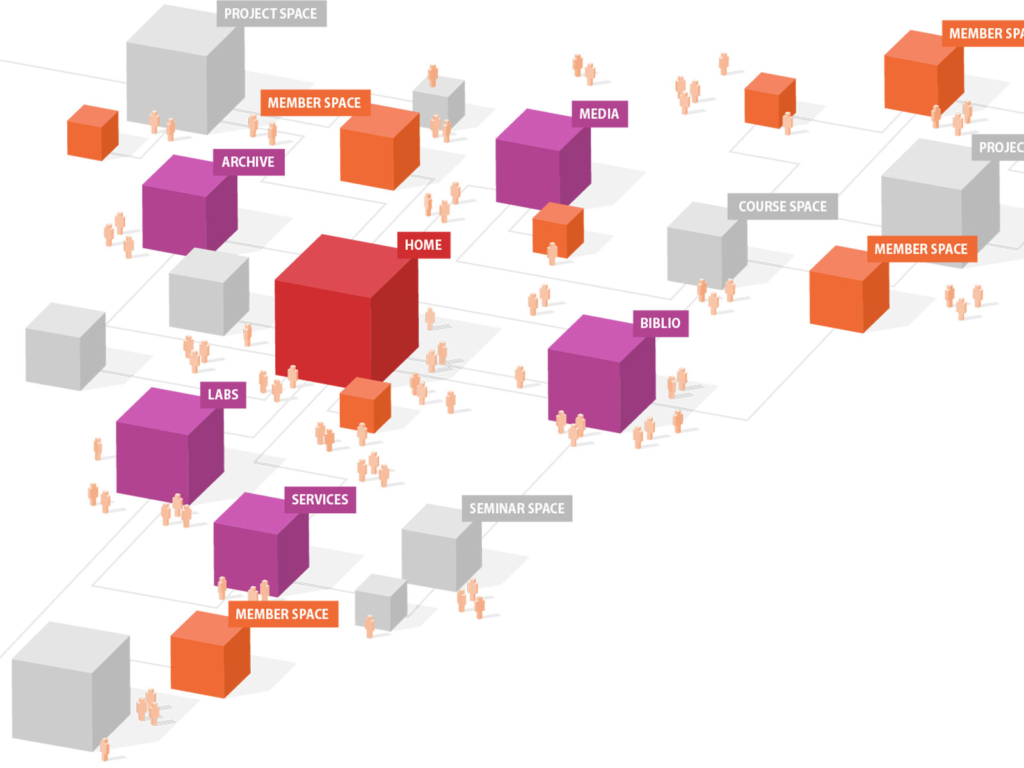 All actions initiated and performed in Spaces expand the digital knowledge base. Open data and exchange formats enable the flexible handling of data that can be accessed and managed in different, even external sources. Digital services such as an archive, a video platform and an online bibliography are offered in Spaces. The archive contains project, bachelor and master theses that are tagged and accessible for all members of the community. All recorded lectures and presentations are provided via the »Media« service. The »Biblio« service offers the easy integration of literature sources. All these services are integrated into Spaces and create a transparent, permeable and living knowledge base that accompanies and supports research, teaching, and learning.