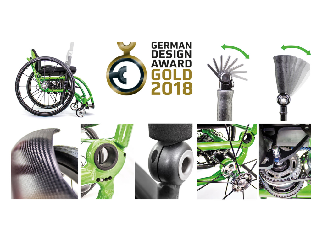 The wheelchair radius has been awarded the German Design Award Gold 2018 in the category of “Medical, Rehabilitation and Health Care”. The adaptive wheelchair had been developed by the Cologne-based start-up company Desino and is based on a graduate thesis of KISD alumni Thyl Junker at KISD – Köln International School of Desig: in the area of expertise “Design for Manufacturing“ supervised by Prof. Hatto Grosse.