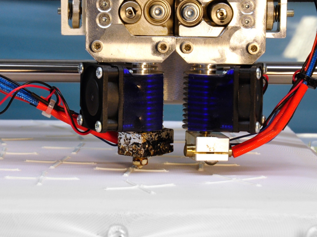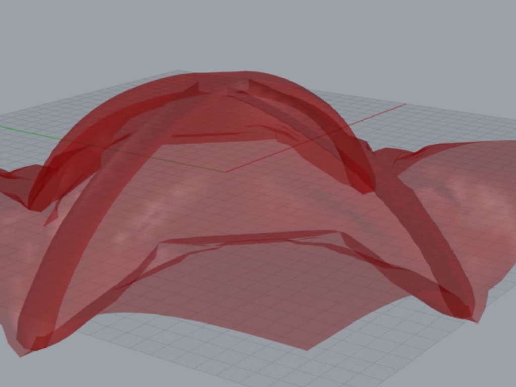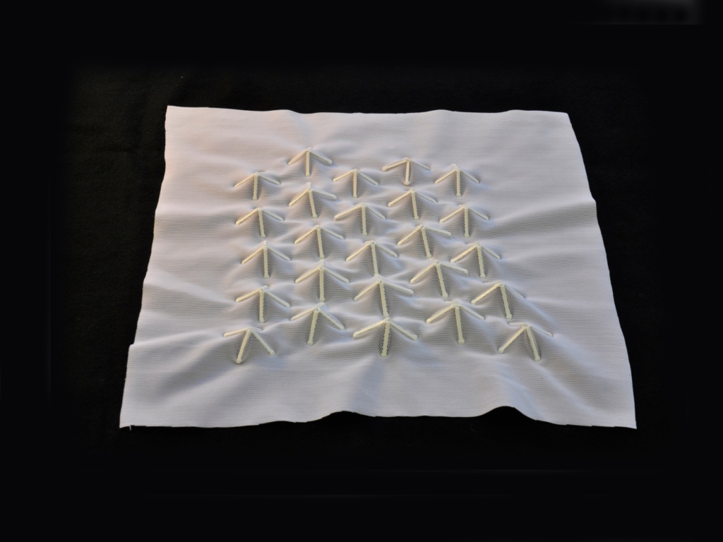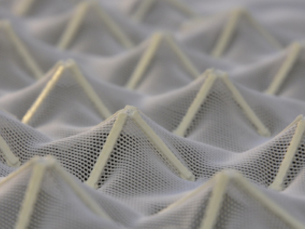 The project work “sonogrid“ analyzes and presents possible options for acoustic noise insulation of highly frequented public spaces. The 3D-imprinted, coarse-meshed fabric and its pyramid-like structure absorbs/breaks sound and generally improves the acoustics of the room. The solution combines the use of textiles for noise insulation with the benefits of rapid manufacturing. The stretched material is imprinted by fused filament fabrication and forms a three-dimensional structure when in a relaxed state. 3D-printing also allows structures to be produced in different sizes, alignments, and patterns. This allows the product to be tailored as much as possible to local requirements. This pattern can be adjusted to suit the spatial conditions on location because it is easy to trim and can also be applied to irregular surfaces. 3D-printing technology also allows the material to be printed on site in a flexible, customisable manner.