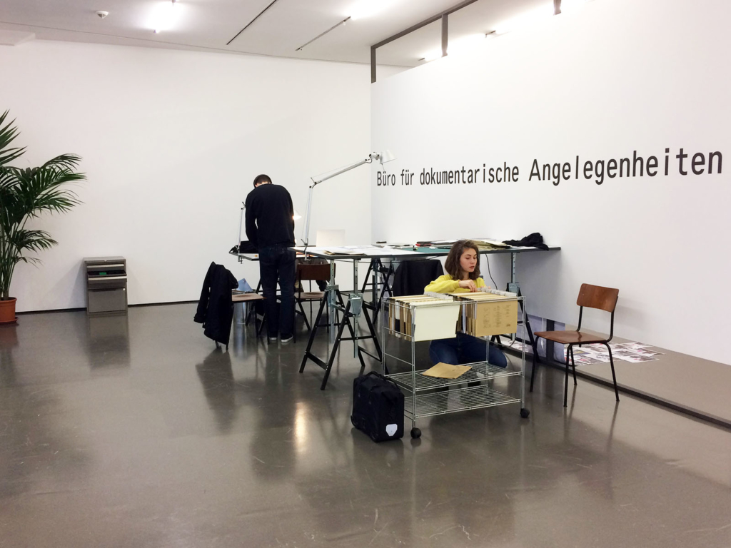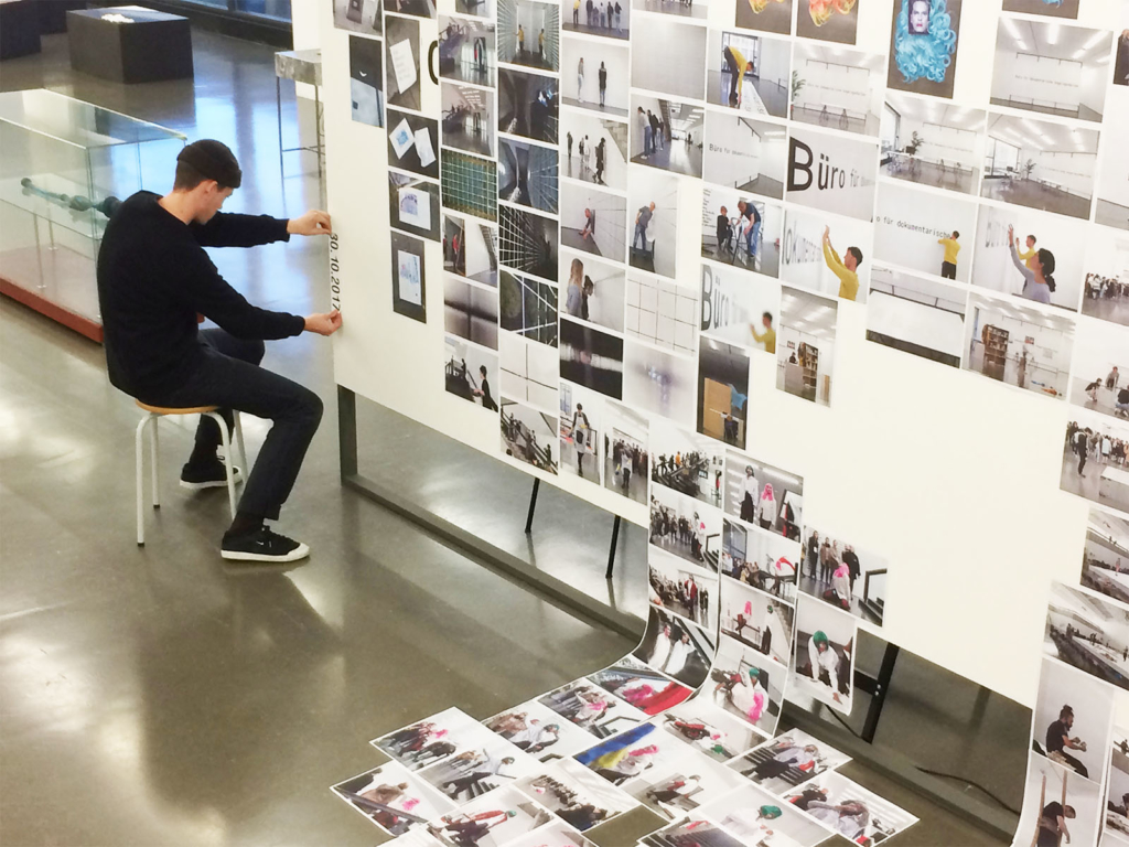 On the occasion of the exhibition »Akademie [Arbeitstitel]« (»Academy [Working Title]«) in the Kunsthalle Düsseldorf 2017/18, a team of six KISD students designed a temporary and constantly changing workspace – the »Büro für dokumentarische Angelegenheiten« (»Bureau for Documentary Affairs«).