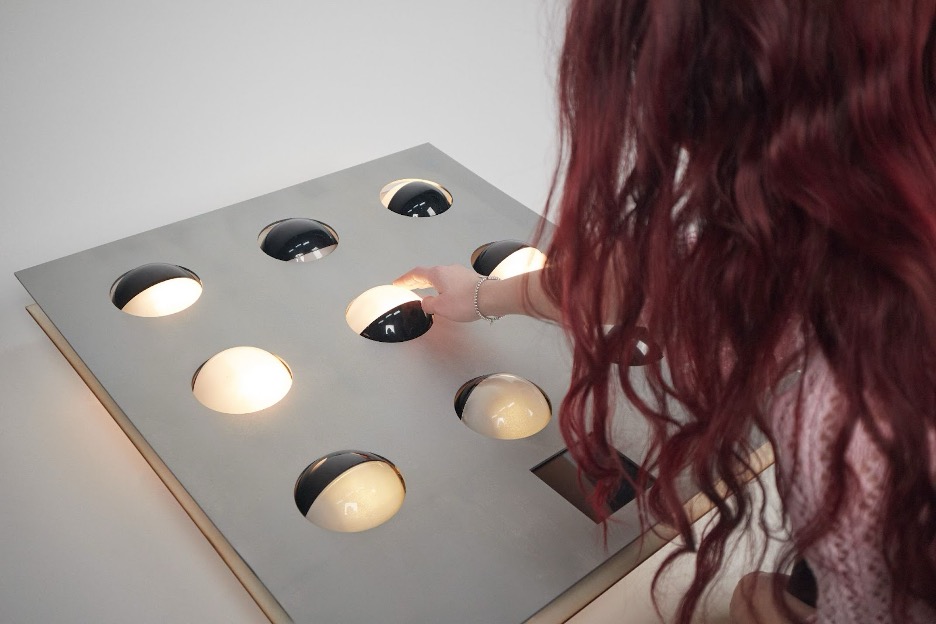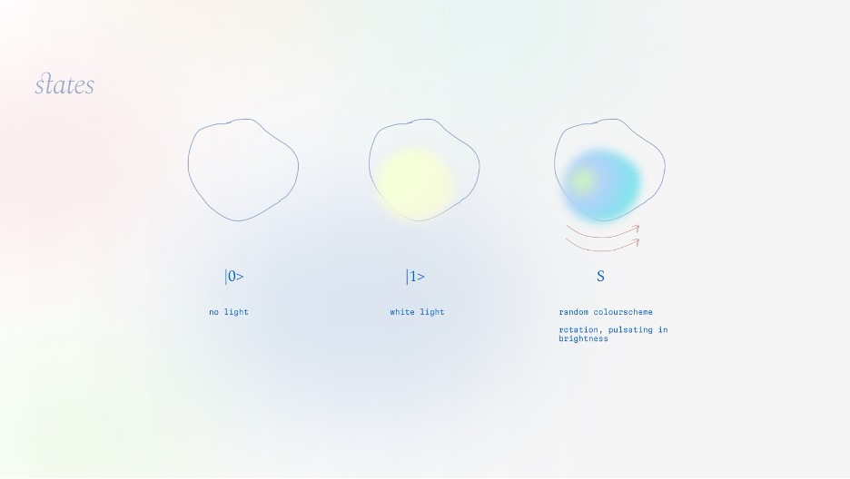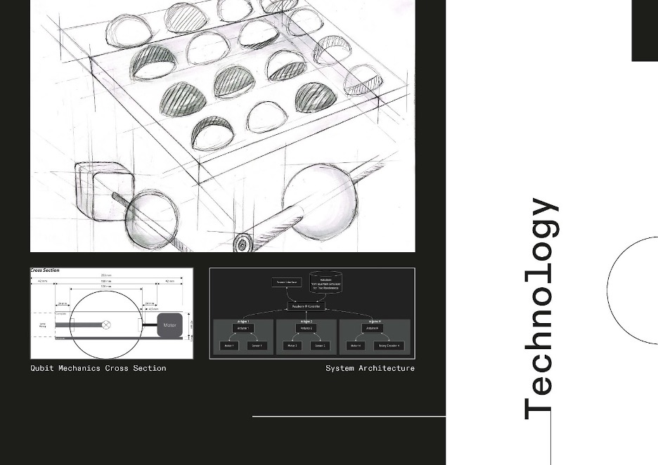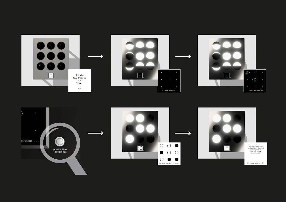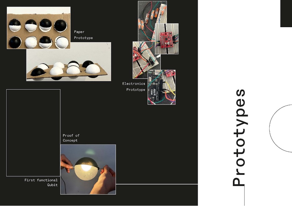 Visitors can manually rotate the spheres, this interaction visualizes how quantum gates manipulate the quantum state of each qubit. Altering the amount of light or dark allows the visitor to physically control the measurement probability. This reflects the aspects of superposition and gate application. The haptic interaction allows for a memorable experience.