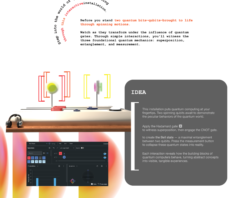 [gates and states] is an interactive installation that shows off quantum computing through engaging storytelling. Based on IBM’s Quantum Composer interface, visitors can explore quantum concepts through their preferred narrative style – whether technical, mystery, or conversational. By transforming complex scientific principles into tangible, hands-on experiences, this audio-guided journey makes quantum computing accessible to visitors from all backgrounds.