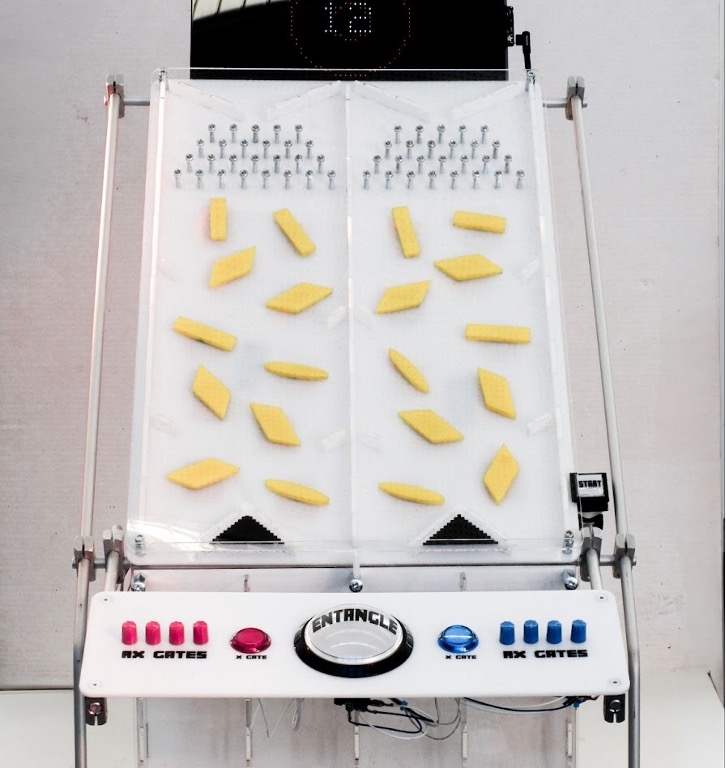 This interactive exhibit introduces the audience to quantum concepts of entanglement, gates, probability, and qubits through an interactive game. Inspired by old arcade games such as Plinko and Pinball.