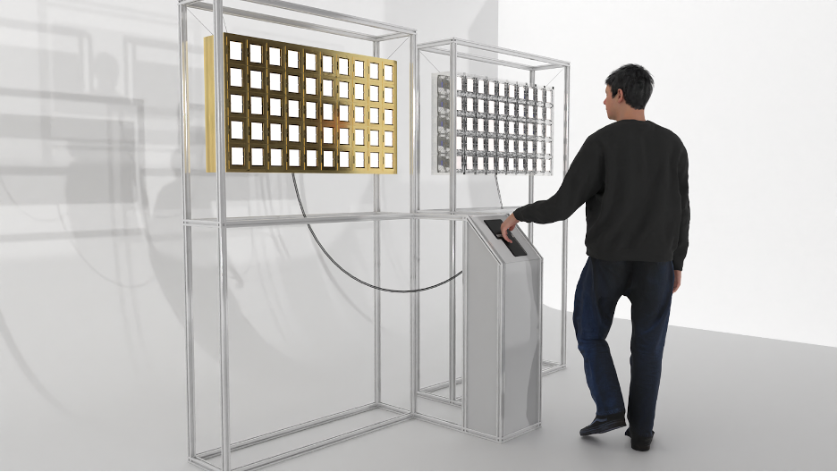 A display guides through the interaction, providing instructions and additional information. When visitors get to the measurement function and press the button to activate it, the true quantum nature becomes apparent. Motors rotate the spheres to their final position of either pure dark or pure light.