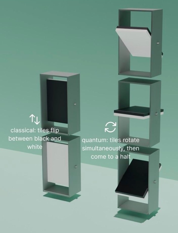 The idea is to demonstrate the operative functions and distinct characteristics of QBits (quantum bits) in parallel computing by displaying a grid of moving tiles, white on one side and black on the other, and comparing it to an identical setup, which represents the classical computing process.