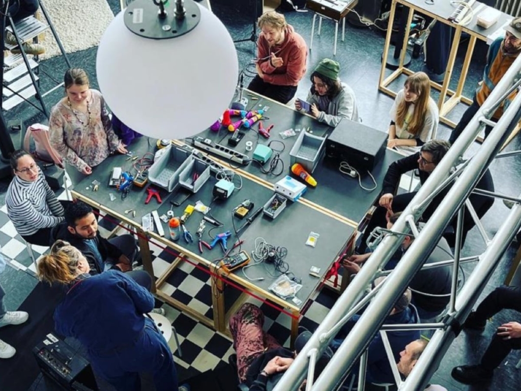 In a collaborative 80s/90s media archaeology environment – where repair cafe meets karaoke bar –, the students took a bottom-up approach that remixes pre-existing artefacts, movements, trends and histories of music and sound. Through lo-fi material exploration and analogue production, they tried to imagine political sound design systems that encourage spatial performativity.