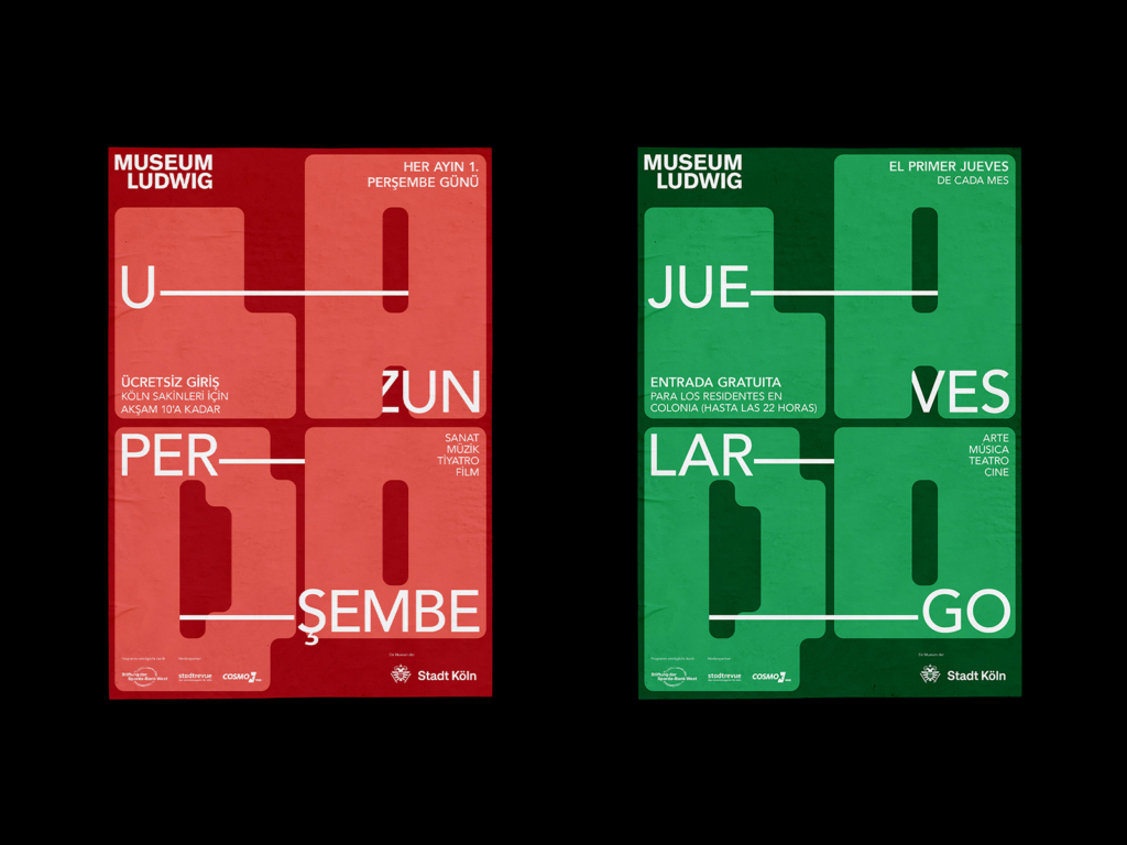His concept of calling the “Long Thursday” “LADO” from now on is recognizable across all media and strongly characterizes the new design. The four large letters form the basic building block of the design, regardless of the medium. In addition to the posters, there are also adaptations for stickers, Instagram, Facebook and the museum’s website. Further adaptations for various media will follow in the near future.