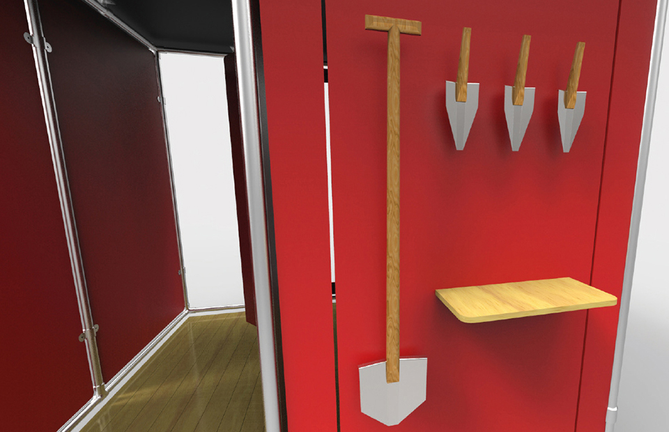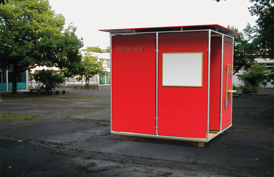 1. The “Redbox“ is a cube which is easily accessible, which can be easily cultivated and which does not need massive outside support for vegetation and cultivation. The box was in particular designed for usage in schools with limited outside space. Its form follows the idea of designing the box as a cube for raised-bed gardening, but it can also be utilized on surface. The construction offers a huge variety for cultivation. Rotatable boards from outside serve as means for diversified applications during exercise and instruction at school. If locked, the cube can also be utilized for storage of technical equipment for gardening.