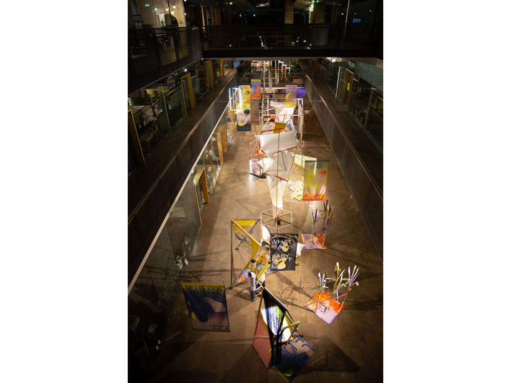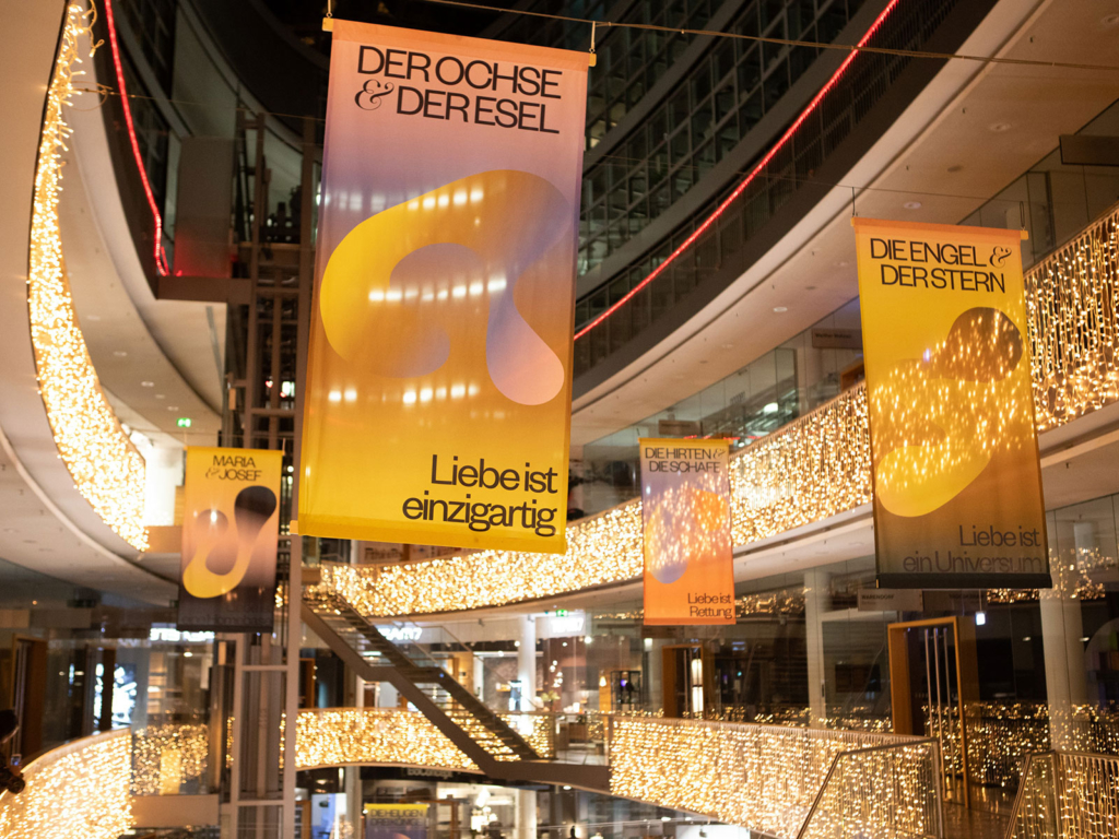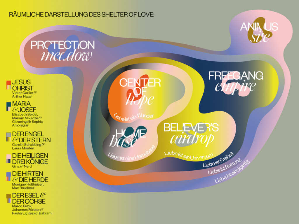 The ”Shelter of Love“ campaign translates the Christmas story religiously neutral into a big scale spatial installation. On content level, it reflects the typecast within the shelter and questions the relationships of the characters of Jesus Christ, Maria and Joseph, Angel, the three Magi, Shepherd and Sheep, the Donkey and the Oxen, in order to transfer them into present day. The idea and the concept was designed by Berlin studio Letters Are My Friends, who were asked by stilwerk to creatively direct the crossmedia campaign. One core element became staging a room-filling installation through interior design elements. The idea was born to deliver a contemporary interpretation of the traditional nativity scene and to realize it together with KISD. What is a shelter exactly? What has to be protected in these and modern days?