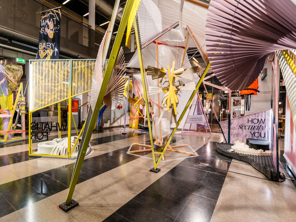 In a KISD-project supervised by Prof. Nina Juric and Gerd Mies, 12 students discussed these issues, conceptualized and finally drafted six tangible and spatial areas constructed with materials such as aluminium profiles, foam, window blinds, industrial bags and cushions. The derived design spaces and artistic positions thereby refer to currently highly debated topics such as home, solidarity, and freedom. “Our installation is aimed at reminding the observer of the importance of active participation and action with regard to protecting fundamental human rights. Today, everybody can be a ‘whistleblower‘ and can be involved in a kind of protest that defends and safeguards our ideals and values,“ KISD students Max Brückner and Monique Holthuizen indicate in describing their installation dealing with the role of the Shepherd and the Sheep.