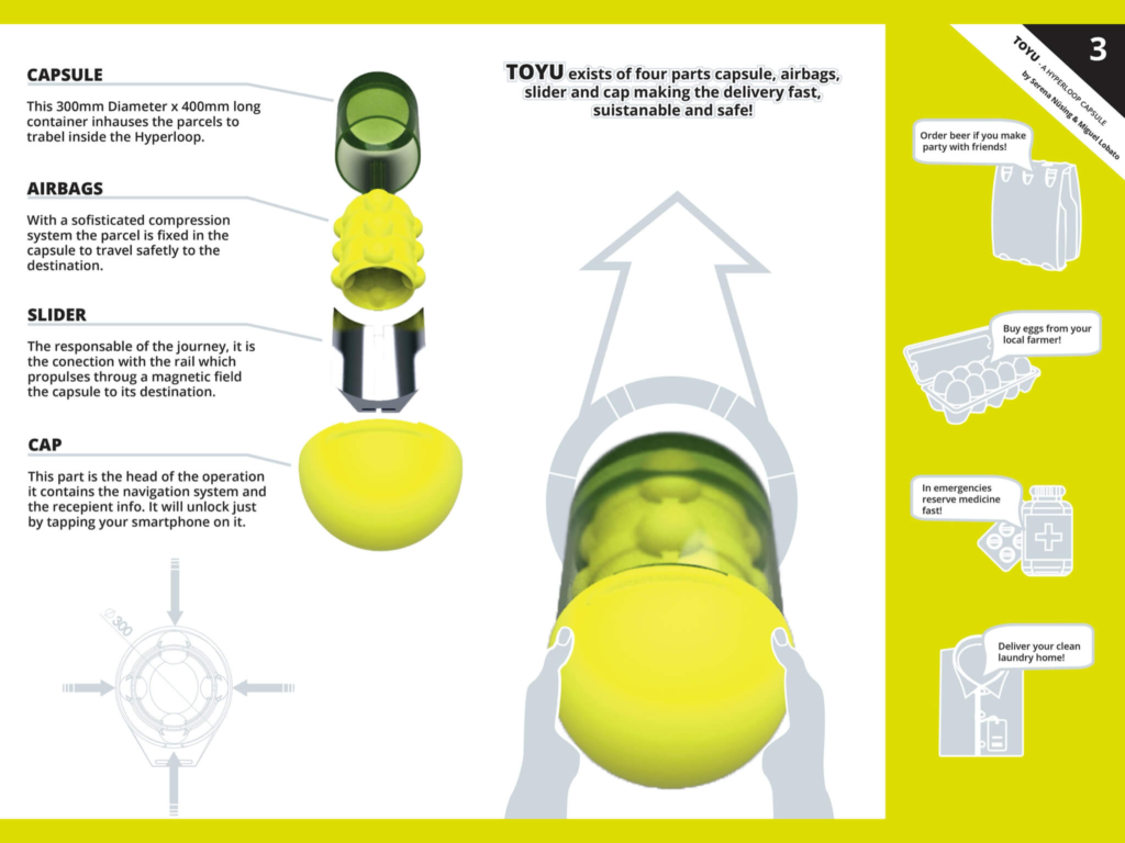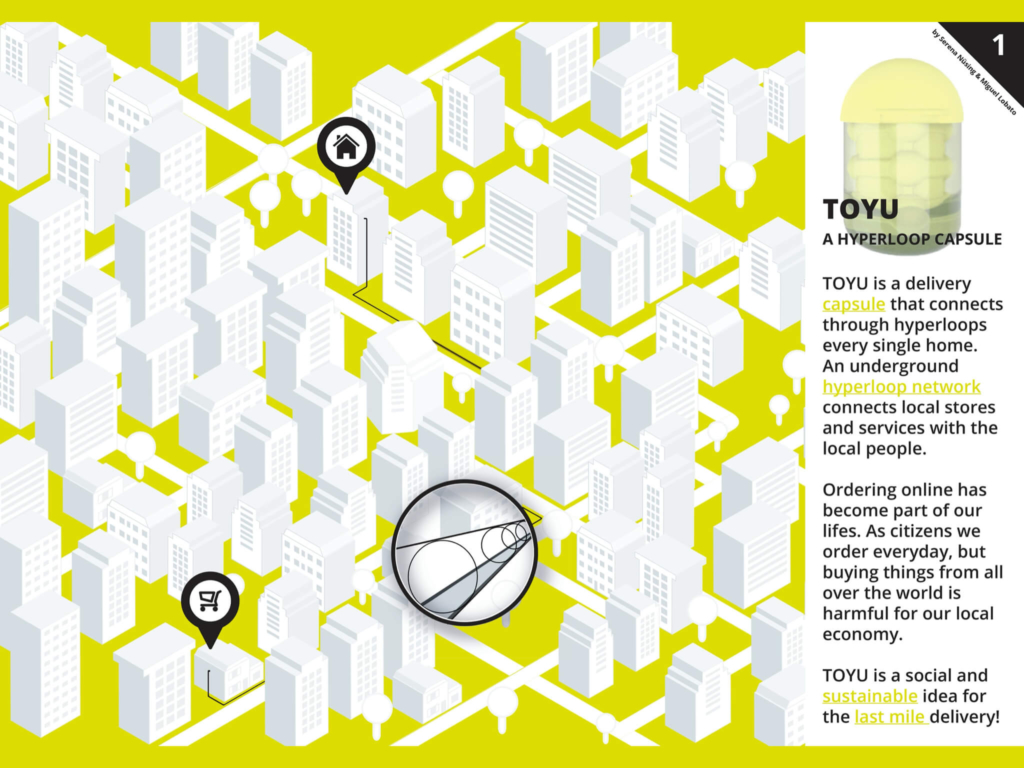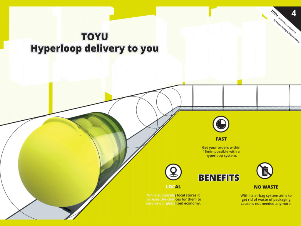 TOYU is the name of Serena Nüsing’s and Miguel Lobato’s proposal of a “Hyperloop Delivery Network”. Ordering online has become part of our lives, as citizens we order every day, but buying products from all over the world can be harmful to our local economy.