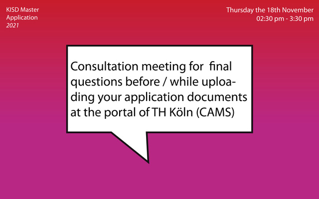 While the TH portal CAMS is open for master applications during 15 – 17 November we offer a consultation meeting on November 18, 2021, 02:30pm (ECST) for all final questions before/while uploading your application documents.