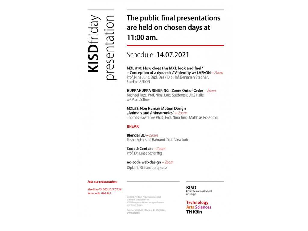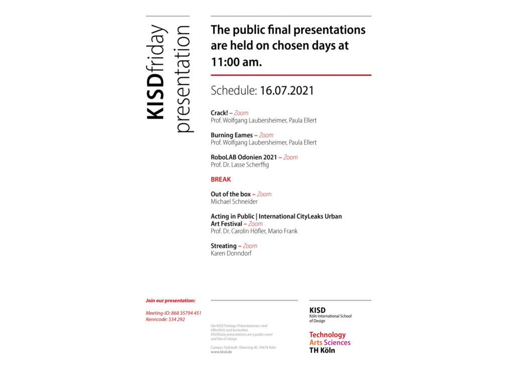 On Wednesday (14.07.2021), Thursday (15.07.2021) and Friday (16.07.2021) the last public presentations of the summer semester will take place.