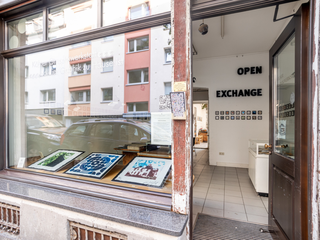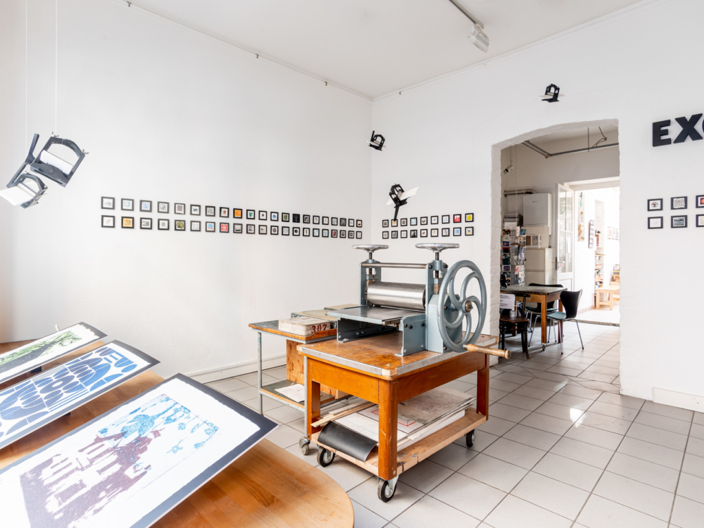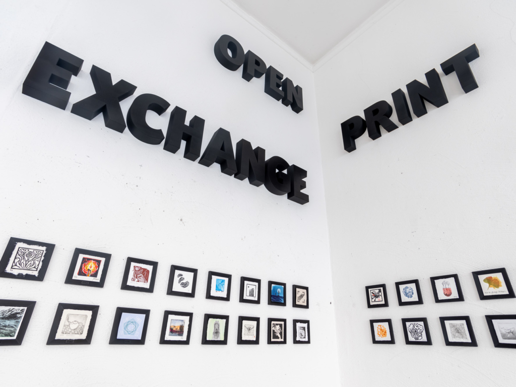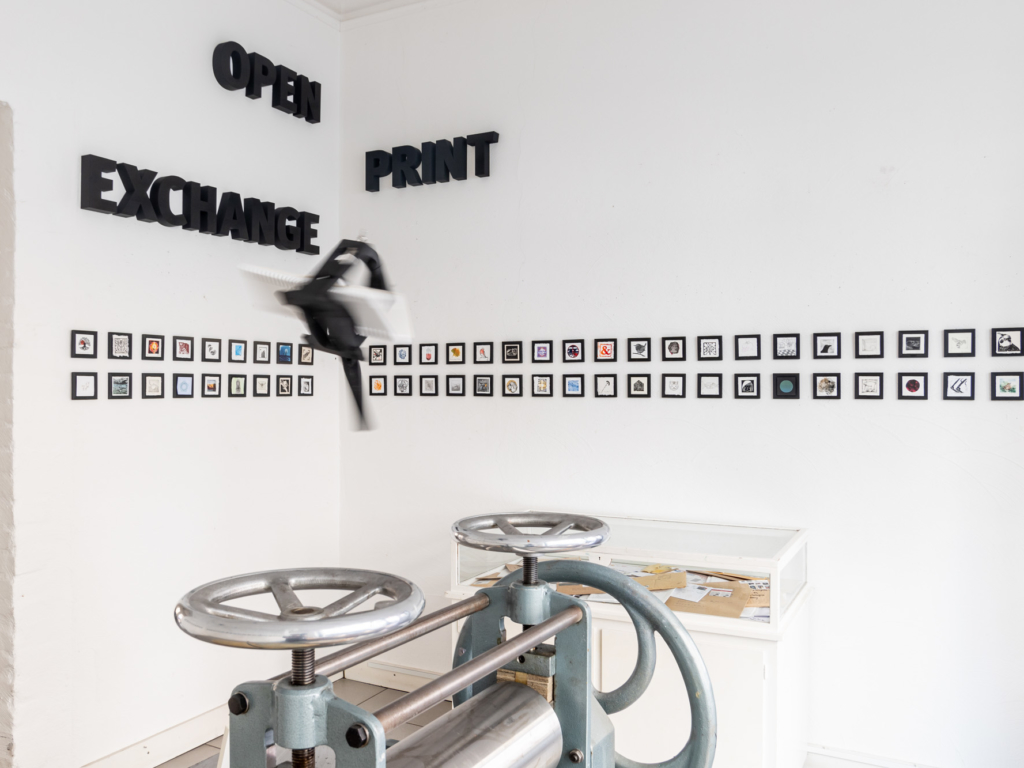 As a follow-up project, the two of them organised a print exchange for Open Press-owners. Participants created an edition of ten original 7x7cm prints, which were sent to Cologne, randomly exchanged for nine prints by other printmakers, and then sent back. More than 300 creatives from 26 countries joined in.