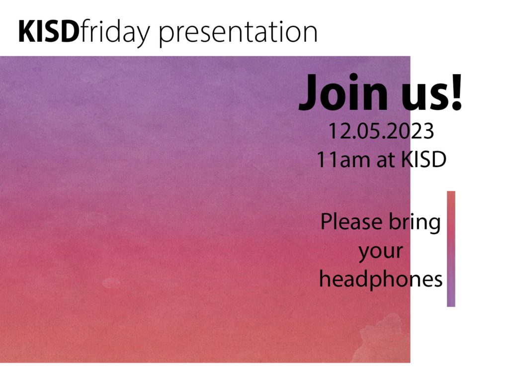 The first Friday Presentations within this semester start on Friday, May 12th, at 11 p.m. in room 240 at KISD.