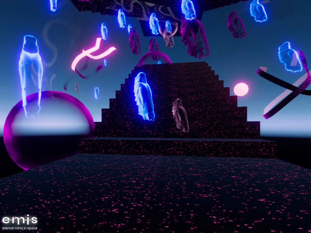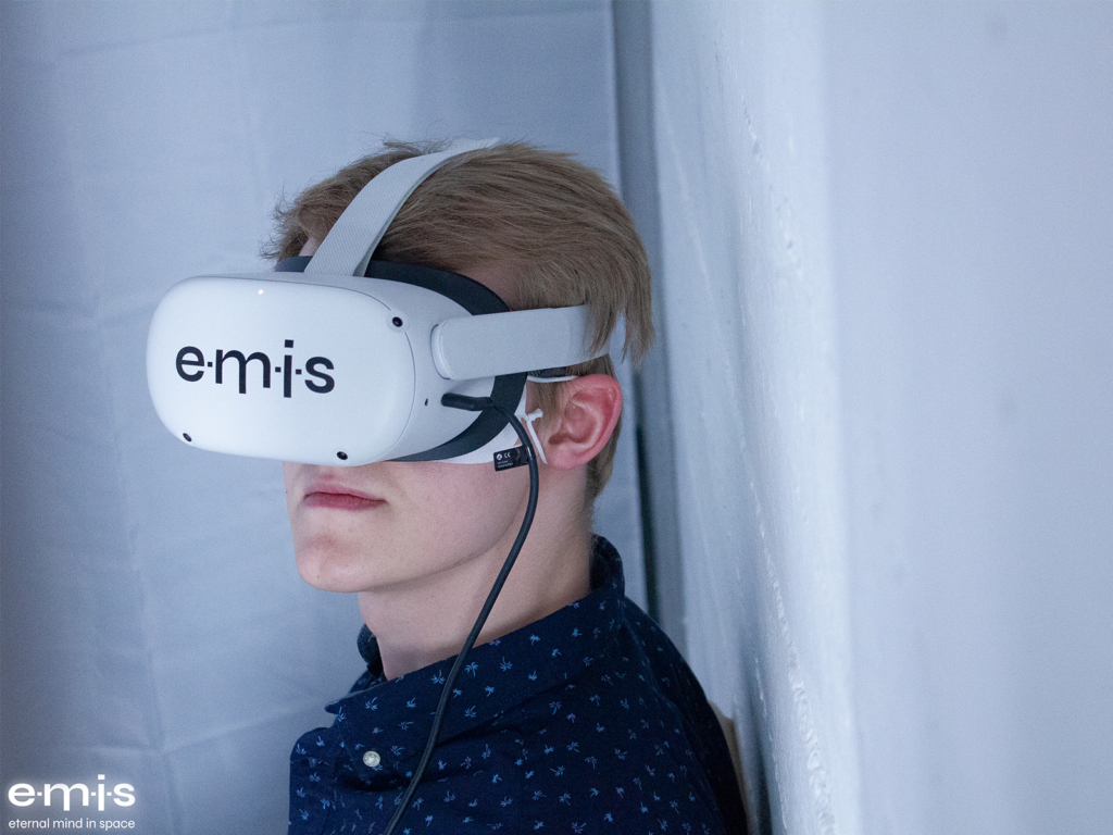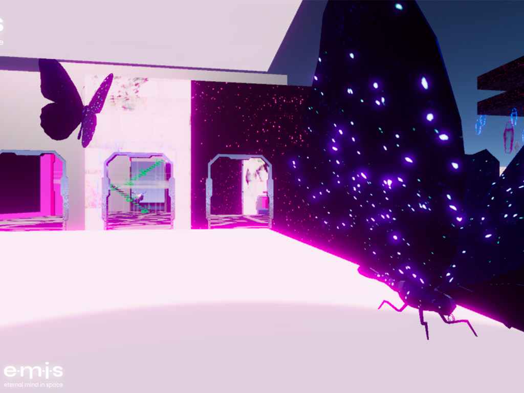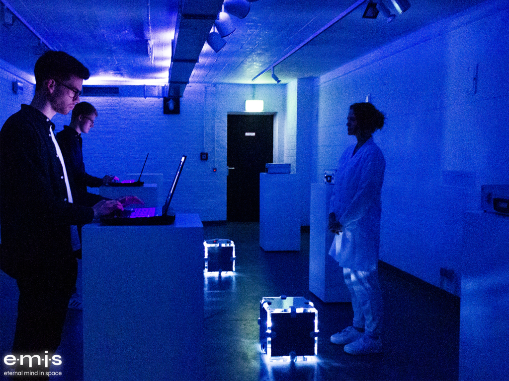 »Central themes of transhumanism are incorporated into the design of physical and digital spaces. Through the ›upload of consciousness‹ based on personal data, a mind upload of the visitors in the company e.m.i.s. (eternal mind in space) is processed and critically reflected,« is how the directors Carolin Schabbing and Lisa Peter describe their concept. With this in view, the question arises as to whether aspects of consciousness and identity can be transferred to phygital spaces? What forms of interaction and design are possible in them? Does interaction in phygital spaces change the consciousness and identity of the visitors?