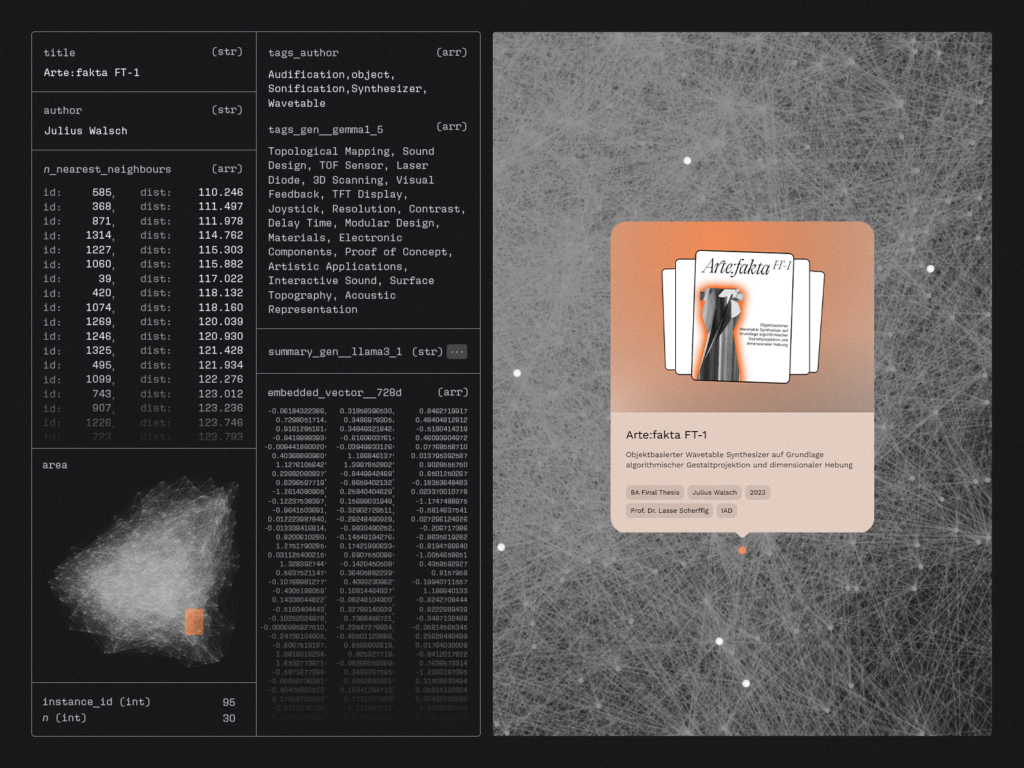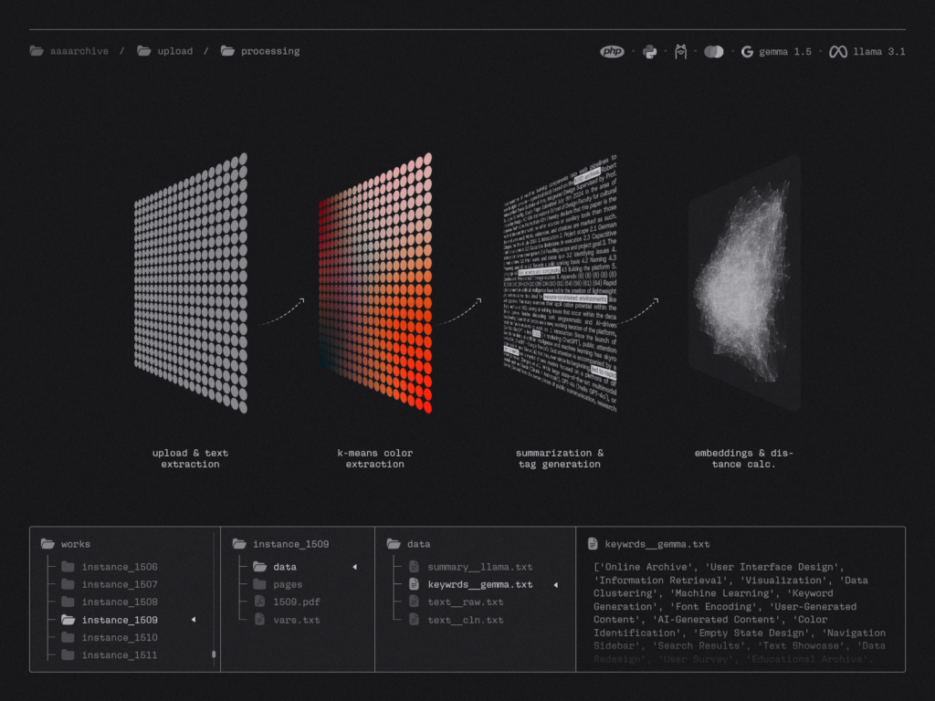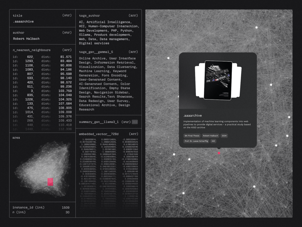 Optimized for use in resource-constrained environments, these offer opportunities to integrate into patterns like web pipelines, where lightweight and efficient solutions are crucial. Exploring potential applications within a real-world scenario, “.aaaarchive” aims to solve problems that have built up over the years within the KISD archive. This exploration resulted in a new iteration of the archive platform that featured AI functionality on multiple occasions—such as automated tag generation, cover color extraction, and a vector-based recommender system.