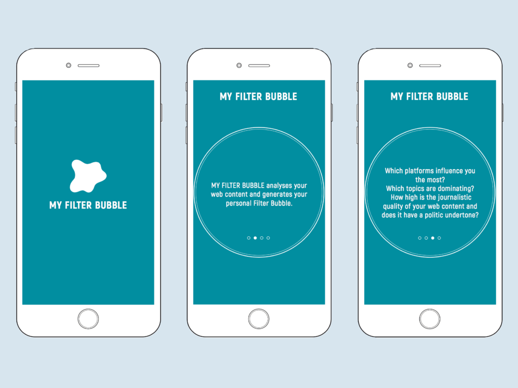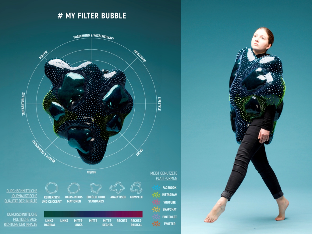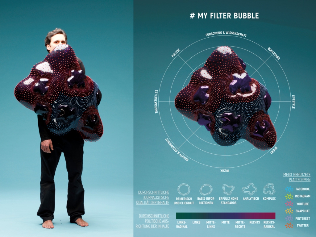 In order to make the complex personalization processes of the Internet visible, a method was developed to record and evaluate the full web content of several test persons over a longer period of time. The results were translated into infographics, which in turn were used as the basis for creating wearable models of the different filter bubbles. Each model visualizes the online world of one particular test person, from prevailing platforms and topics to the journalistic quality and political undertone of the content, thus making a multi-layered problem tangible. The app MyFilterBubble, which was designed on a similar principle, allows you to find out in which way you are affected by the personalization on the Internet. It evaluates your web content to various criteria and then generates an image of your individual filter bubble.