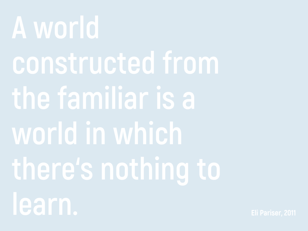 Today the Internet is integrated into almost all processes of our everyday life. It has not only become the most important entertainment medium, it also seems to replace television and print media as a main source of public information. But in contrast to traditional media, the information a user finds on the Internet is highly personalized. Website operators collect lots of information about each user, in order to display a selection of information and content tailored to the users’ interests, preferences and beliefs; content that opens up a new perspective is lost. Since the personalization processes are algorithmically controlled and running invisibly in the background, the Internet user is not aware of the fact, that the things displayed to him are highly individualized and do not show full reality. Without realizing it, the user is trapped in a cycle of one-sided and filtered information, they are isolated in his own filter bubble.