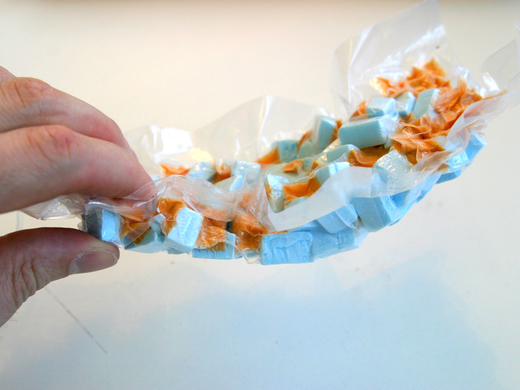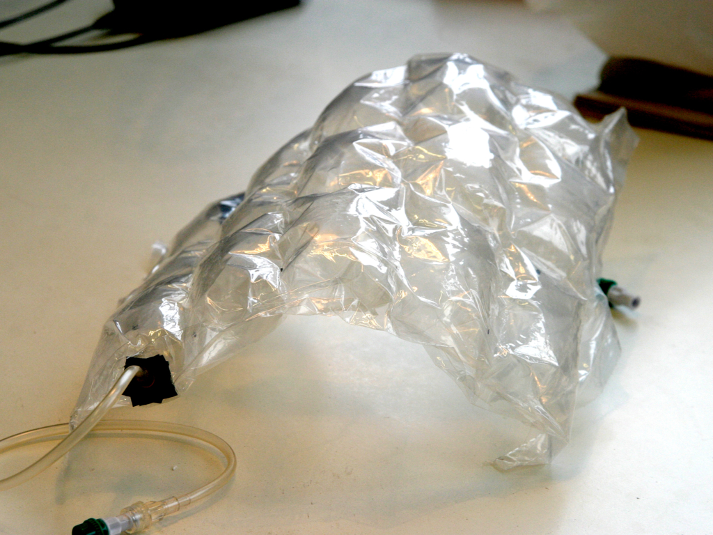Granular materials can be switched between a soft and a rigid state by applying vacuum. Therefore shapes can be stored for a defined time. This principle served as a material base for several prototypes during this research. Granular jamming occurs due to the self-organisation of particles if stress is applied. Force acting on one particle can cause the granules to re-orient and interlock in chains and networks and therefore behave as one solid object. The uniform stress in a vacuumised bag causes the granular material to solidify entirely [2] (Cates, M. E. et al., 1998).