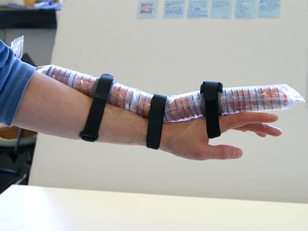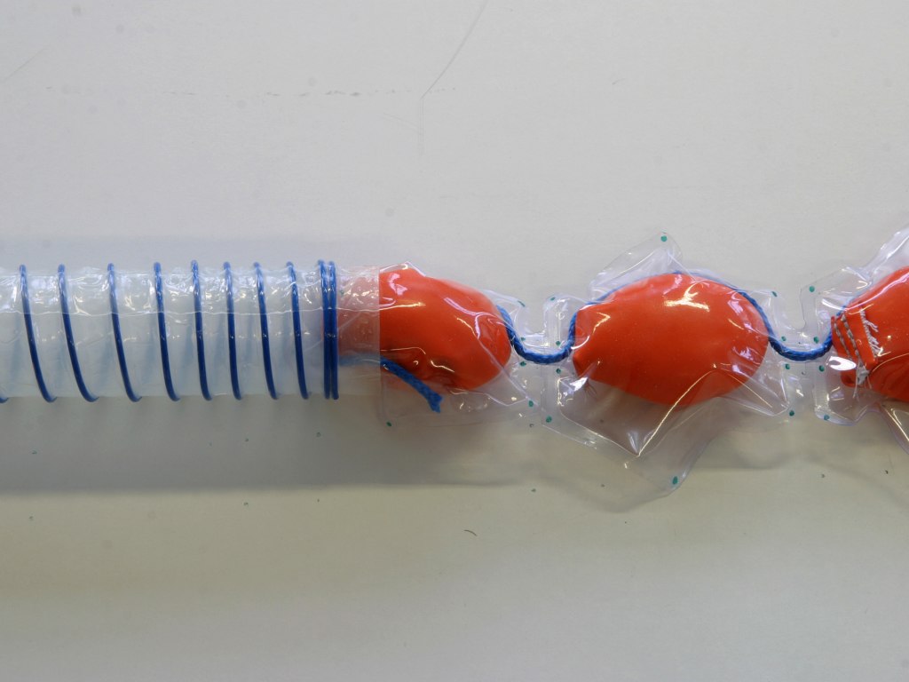 As a first exemplary application, the Meta-Granular System is used as an exomuscle. It can be attached to arms, legs or other body areas and should then support muscle activity. This could be used in physiotherapy, where body motions have to be repeated over and over again. The desired motion is set once and can then be repeated by the exomuscle.