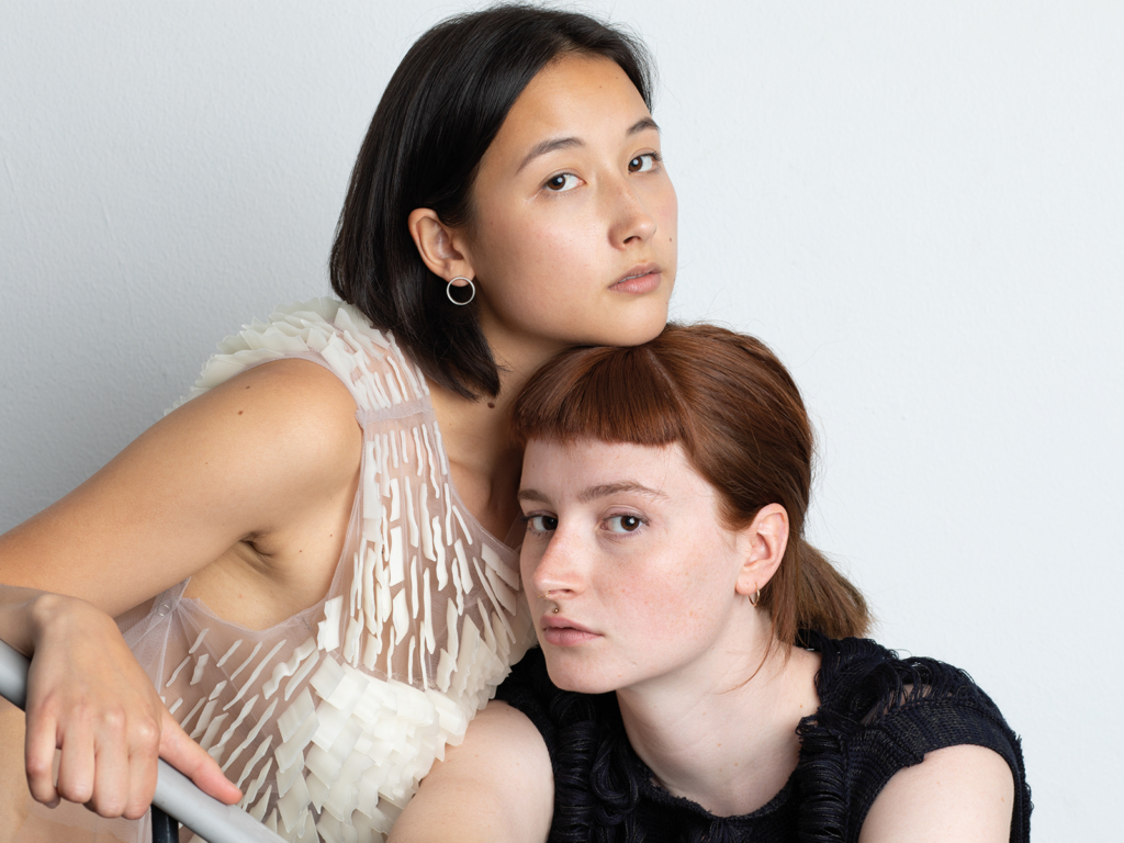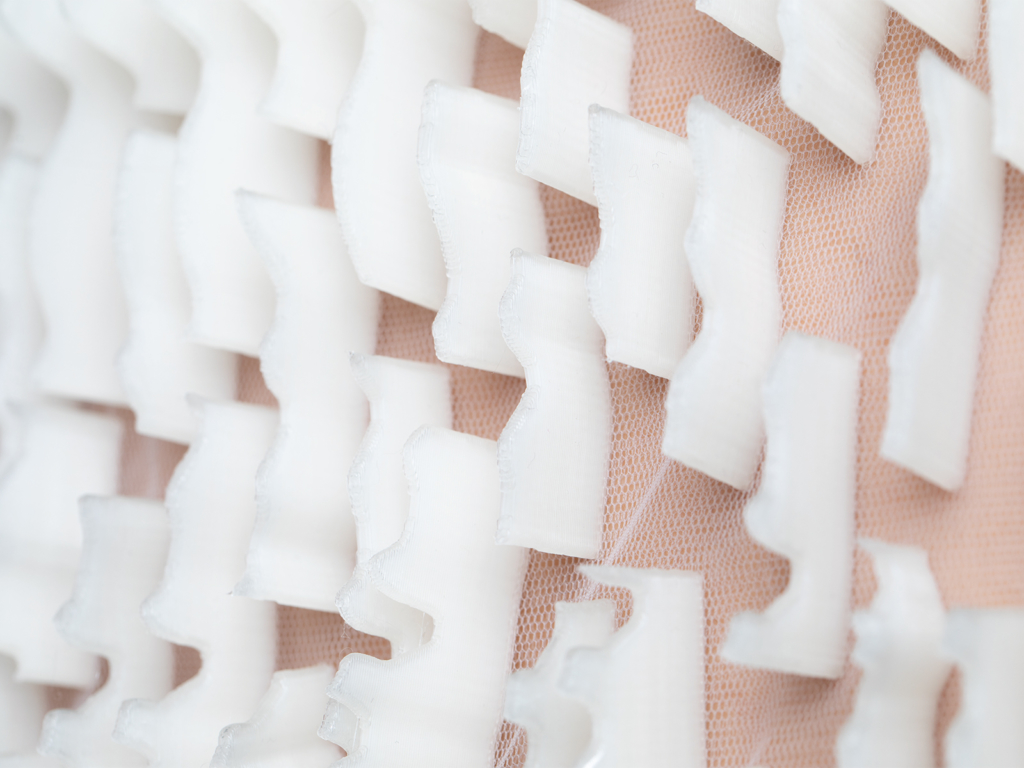 PEEL is a textile collection, created for and with the human body. The textile structures are created from and on the skin. The modules of the textiles develop themselves and they gradually transform themselves on the body. They get into interaction with the body, whereby movements become visible for the observer.