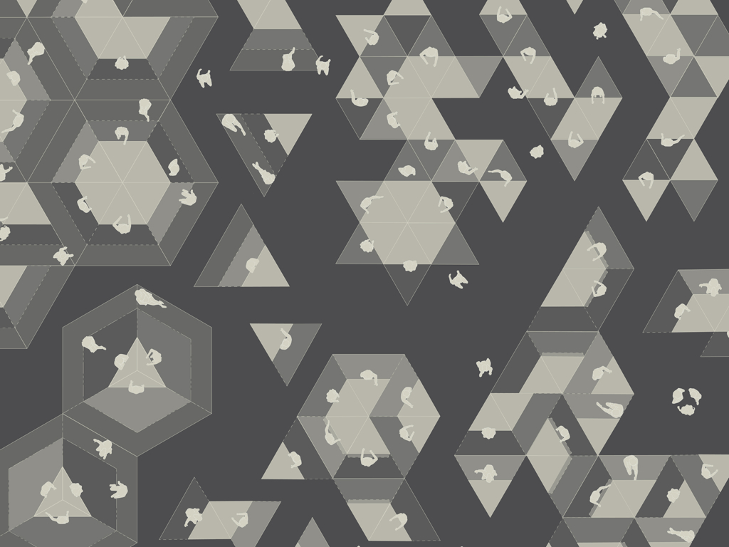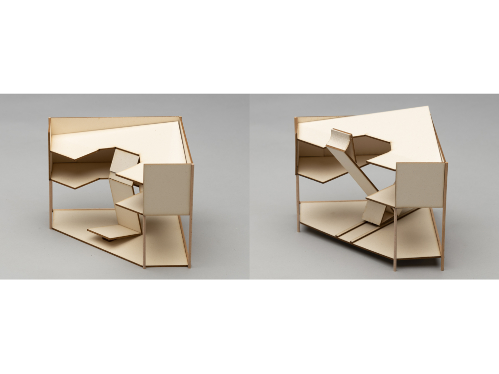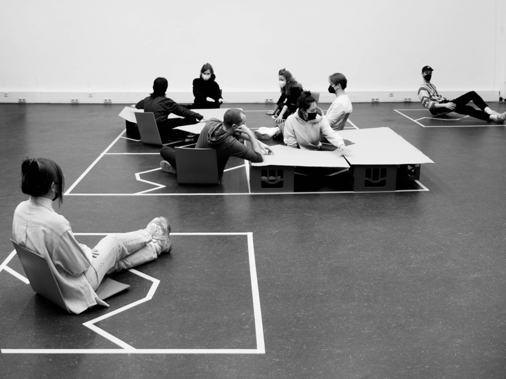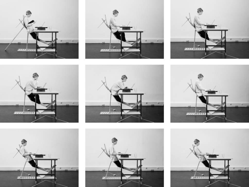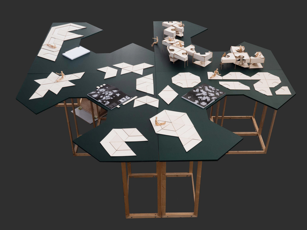 With the help of functional models on a scale of 1:1, modular systems were developed. They operate with different angles of inclination and thus dynamise the standing or sitting body. In a series of experiments, the modules were tested with test persons, evaluated in cooperation with physiotherapists and successively improved. The resulting design is a spatial installation at the intersection of architecture, product design and art. Assembled into a whole, the modular system creates a flexible model space that can be intensively experienced physically and aims to improve the physical and mental well-being of sitting and standing people in work processes.