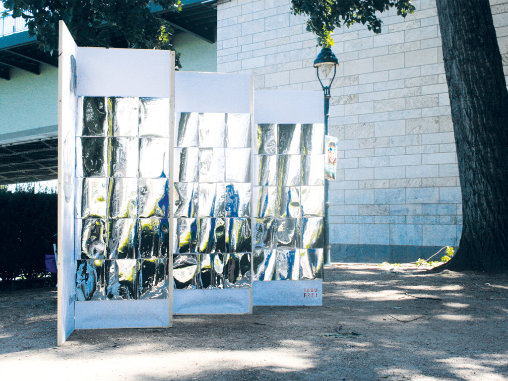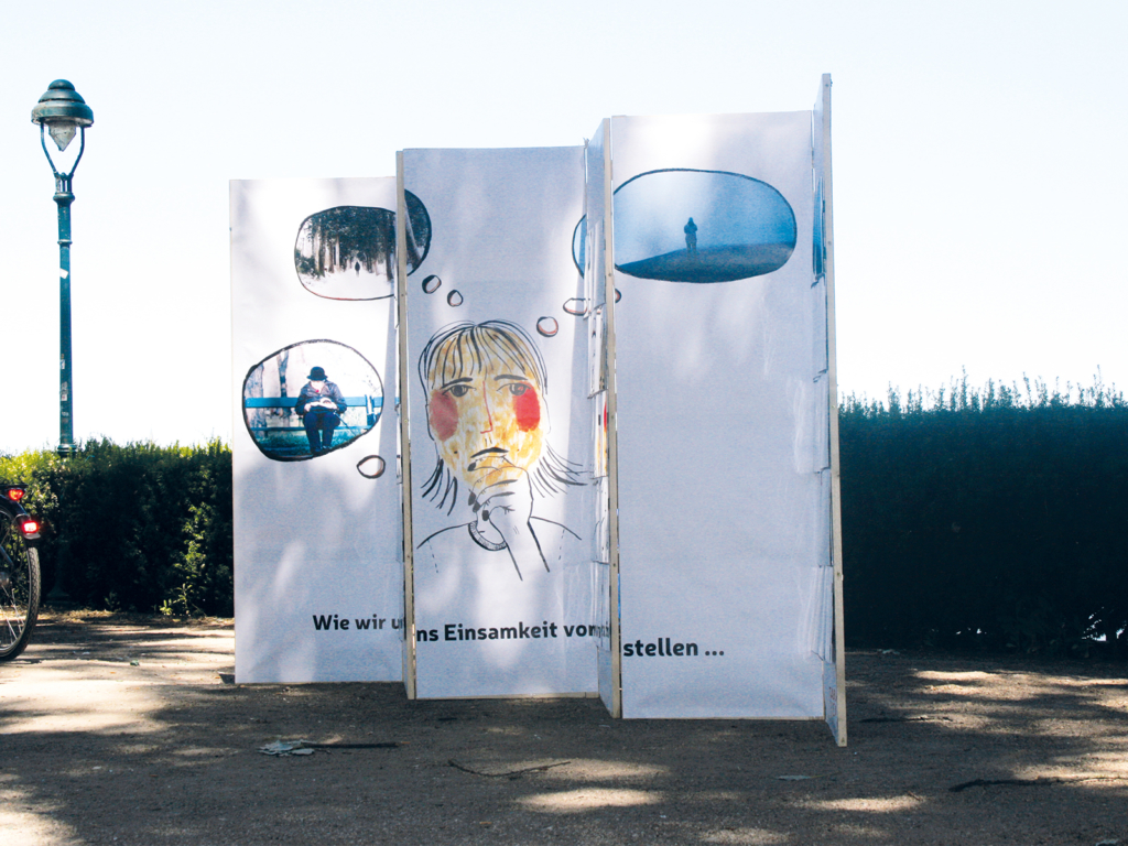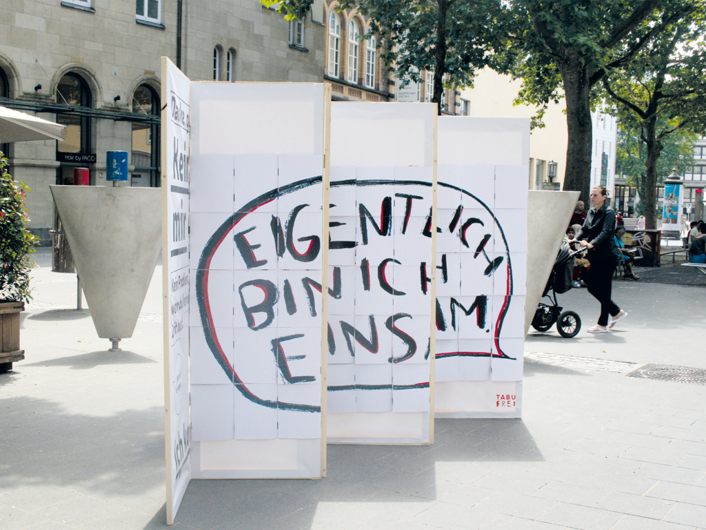 For the project, I designed two three-layered installation walls, that were exhibited in the city centre of Bonn. Depending on the perspective of the passersby, only one of the layers was visible. By changing the point of view, the second layer of the installation became visible. The contentual concept aimed to play with stereotypical and superficial ideas, associations and images, we often connect with loneliness and to question those in the second layer of the installation. In the second layer the people were involved interactively. Here they were encouraged to take one of the 45 percentres, that composed the second layer, to transform the installation and make the third layer visible.