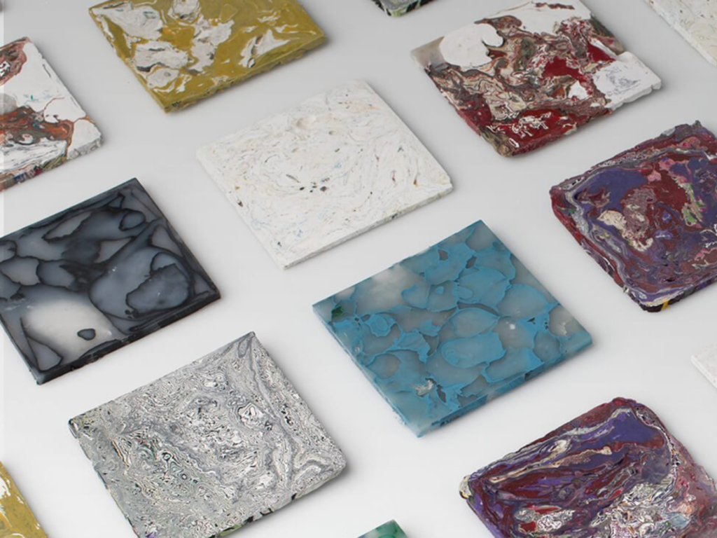 Zum Sonderpreis für Young Professionals an KISD-Absolventin Enis Akiev urteilte die Jury: „Enis Akiev hat sich der bedrohlichen Plastikschwemme in der Natur angenommen. Mittels einer neuartigen Synthese aus Leichtkunststoffabfällen aller Art und der Verbindung mit geologischen Bestandteilen kreiert Enis Akiev durch gesteinsbildende Prozesse Plattenmaterialien mit neuartiger ästhetischer Anmutungs-Qualität.“Enis Akievs Arbeit „Plastic Stone Tiles“ untersucht u.a. das Verhalten von Kunststoff in der Natur und gesteinsbildende Prozesse per se. Daraus leitet Enis Akiev Methoden ab, um Leichtverpackungsabfall eine natürliche, gesteinsähnliche Anmutung zu geben und nachhaltige Recyclingprozesse zu entwickeln – vor dem Hintergrund der seit Monaten schwebenden Diskussion um Kunststoffabfall, Plastikglomerat in Meeren und Umweltverschmutzung durch Kunststoffe ein hochaktuelles Thema, das nun mit dem Sonderpreis der Jury belohnt wurde.