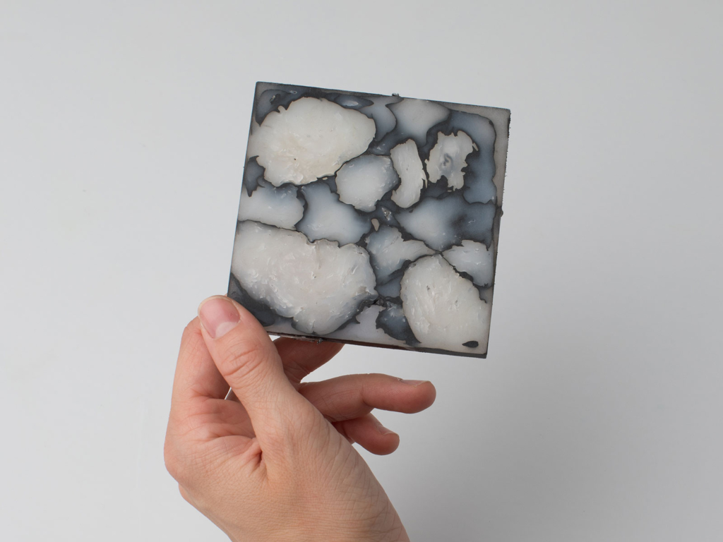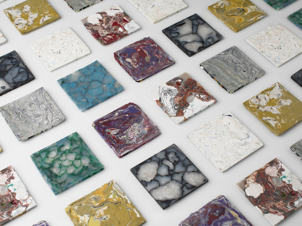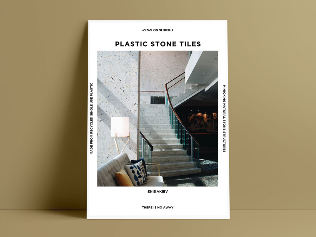 Her work adopts the fact that the majority of plastic waste ends up in the sea making the high longevity, the recycling, and the alternative use of plastic a much debated issue in the media and in environmental politics. Akiev in her work now makes use of plastic waste by transforming it into naturally looking rock-like structures that can be used for interior furnishings as aesthetically valuable material as “plastic stone tiles“. Thus, Akiev through her 2018 BA thesis sheds light on how we perceive natural resources, use and recycle plastic materials and maybe find ways for their alternative use – now to be exhibited at 2019 Milan “Salone de Mobile“ in April.