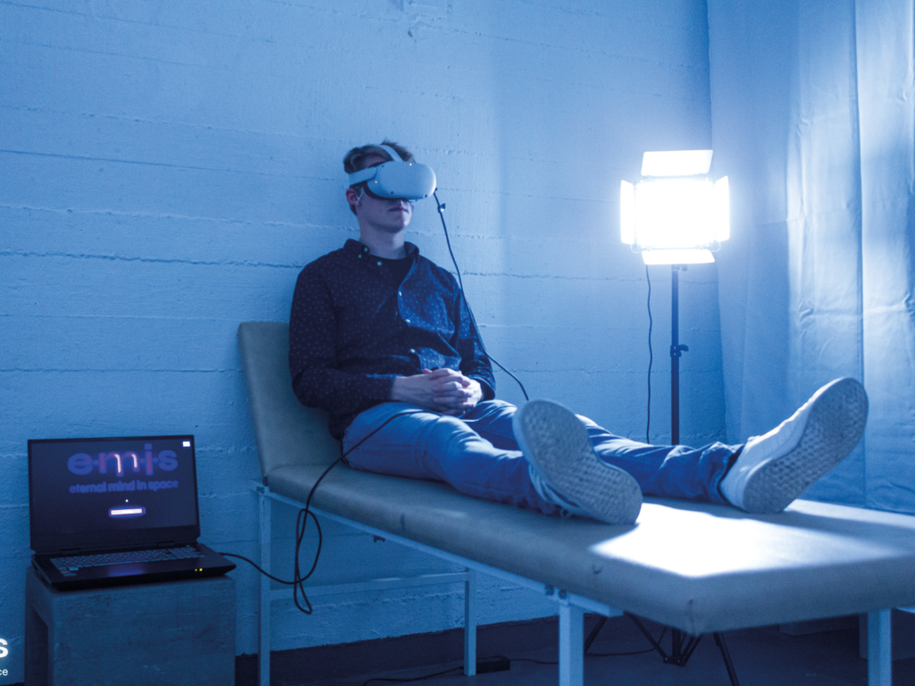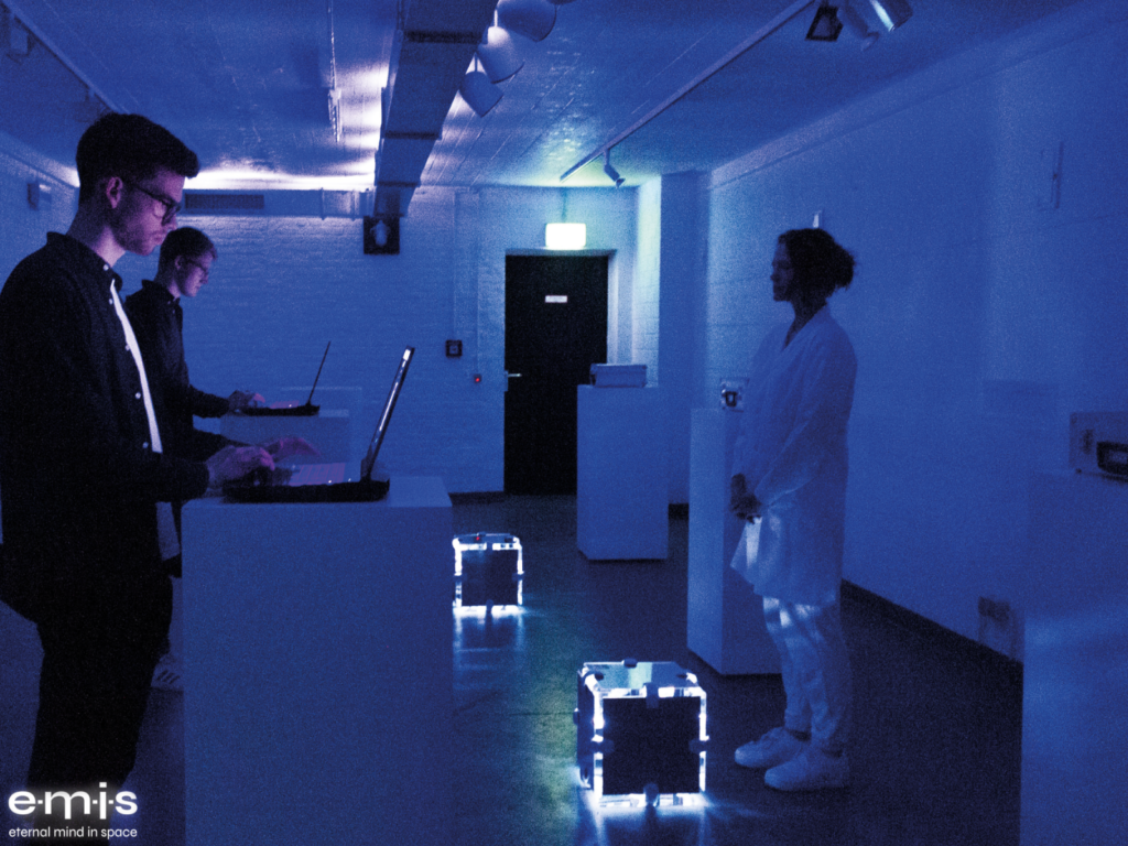 In ihrer Masterarbeit »Data goes Scenographic« untersucht Carolin Schabbing die Einbettung digitaler Technologien und Datakunst in theatrale Prozesse. Sie wurde dafür mit dem dritten Platz ausgezeichnet. In einer immersiven VR-Theatererfahrung wird ein fiktives Produkt vorgestellt, das eine digitale Kopie des Bewusstseins eines jeden Individuums verspricht. Inszeniert wurde die Arbeit mit Akteuren und Besuchern in einer Performance.
