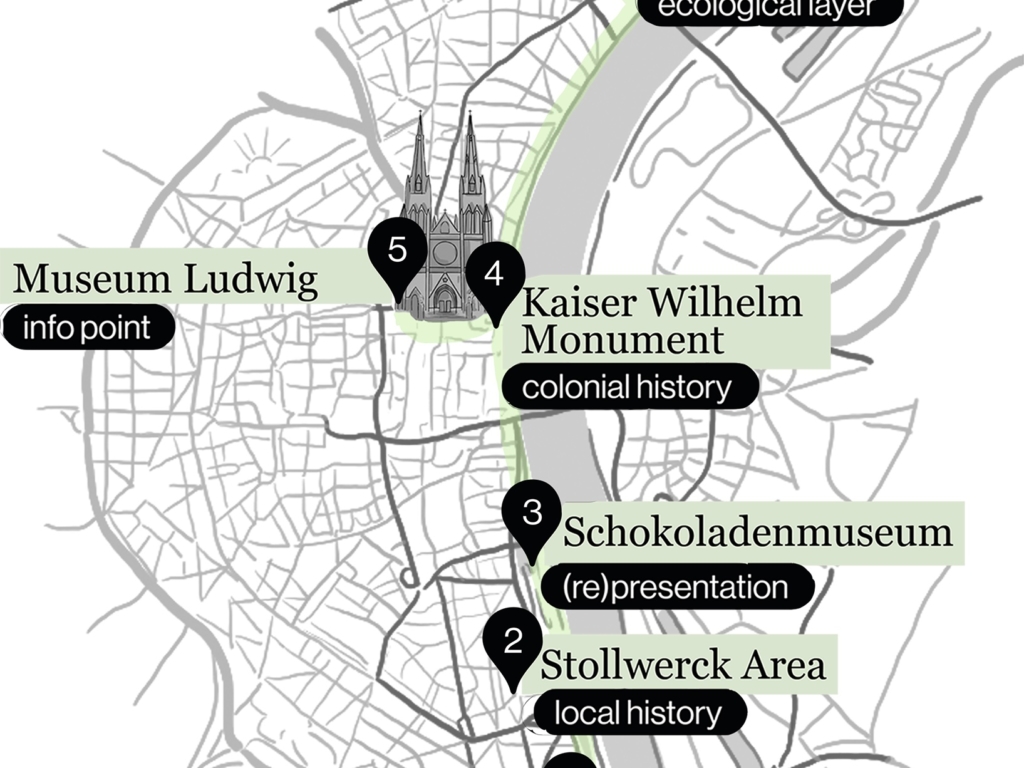 Gegenstand des Projekts »bitter chocolate – Spuren des Kolonialismus in Köln erfahrbar machen« sind die urbanen Spuren des Kolonial-Produkts Schokolade bzw. Kakao in Köln. Die vorläufigen Projektergebnisse integrierten analoge Interventionen und digitale Informationen zu einem hybriden Interaktions- und Lernraum zu diesem Thema. Das verbindende Konzept war eine Stadtführung mittels einer webbasierten App, die es erlaubt, unmittelbar on-site vielfältige Informationen zu den einzelnen historisch kolonialen Relikten und Orten abzurufen. Hierbei handelt es sich um Texte, historische Abbildungen, aber auch um Audio- und Filmdateien, die über ein einfaches Interface auf herkömmlichen Smartphones interagiert werden können.