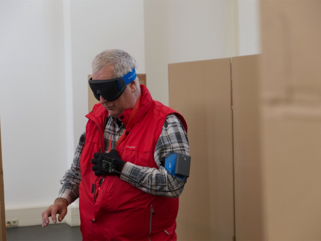 In einer Zusammenarbeit der KISD mit der ophthalmologischen Forschungseinrichtung ZEISS Vision Science Lab der Universitätsklinik Tübingen (Eberhard-Karls-Universität Tübingen) wurde im Rahmen dieses Projekts eine Studie mit dem Unfolding-Space-Handschuh durchgeführt. Bei diesem Handschuh – entwickelt im Rahmen einer Bachelorarbeit an der KISD – handelt es sich um ein prototypisches Hilfsmittel, das die relative Position und Entfernung von Objekten in der Umgebung als Vibrationsreize auf den Handrücken überträgt und es blinden und sehbeeinträchtigten Menschen so ermöglicht, die Tiefe des sie umgebenden Raums haptisch zu erkunden und Navigationsaufgaben wie Objekterkennung oder Wegfindung besser zu meistern. In der vom Masterstudenten Jakob Kilian an der KISD durchgeführten Studie absolvierten vierzehn sehende und blinde Proband:innen Trainings und eine Vielzahl von Hindernisparcours-Durchgängen. Dabei wurde untersucht, ob und wie schnell die Vibrationsmuster vom Gehirn erlernt und für die Navigation im Parcours genutzt werden können. Neben dieser Untersuchung des Prototyps selbst und der Definition entscheidender Kriterien zur Weiterentwicklung des Geräts, stand vor allem auch die Frage im Vordergrund, ob die gewählte geringe visuelle Informationskomplexität und die Applikation der Reize am Handrücken grundsätzlich für taktile Substitution visueller Information geeignet sind. Die Ergebnisse wurden anschließend statistisch ausgewertet, mit bestehenden Hilfsmitteln vergleichend diskutiert und im Februar 2022 nach bestandenem Peer-Review in der Fachzeitschrift MDPI – Sensors veröffentlicht.