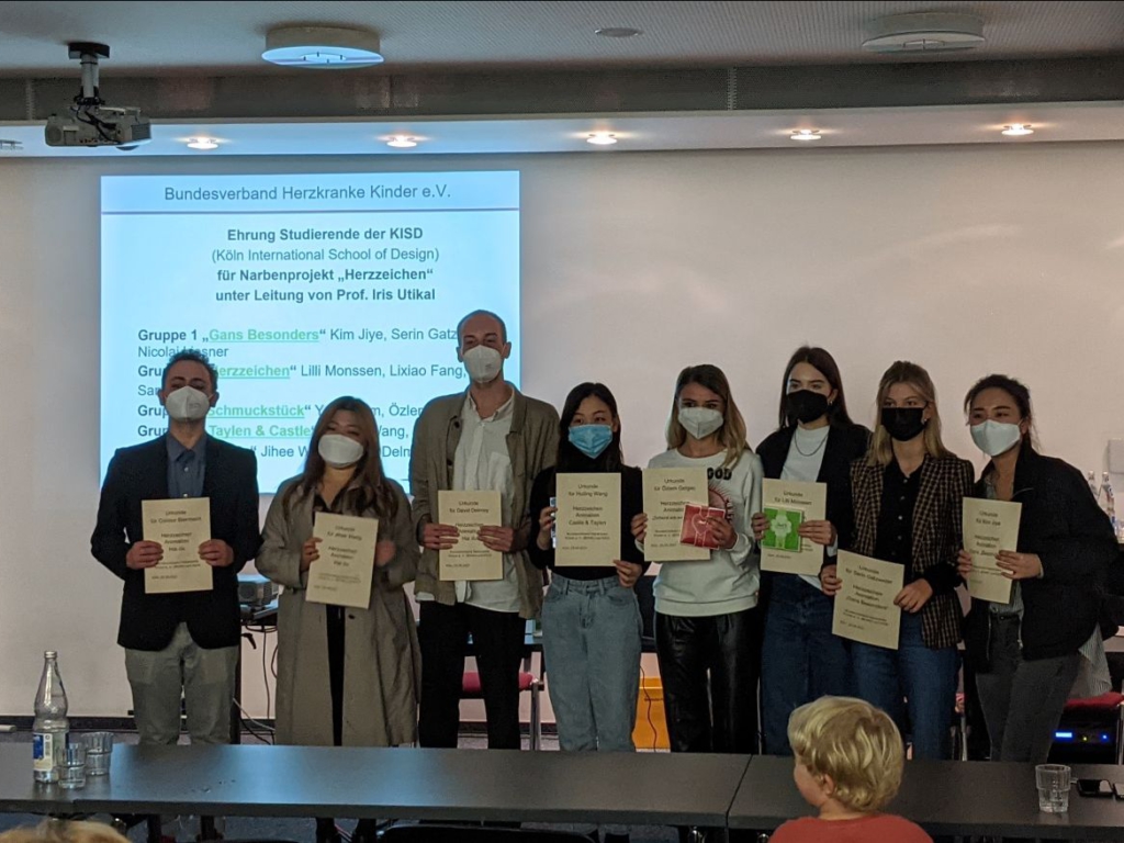 Die Studierenden der KISD wurden vom BVHK e.V. für ihr Engagement, ihre motivierenden Geschichten und deren Visualisierung ausgezeichnet. Initiiert und begleitet wurde das Projekt von Seiten des BVHK e.V. von Hermine Nock, Geschäftsführerin, Prof. Elisabeth Sticker, 2. Vorsitzende, Lea Schornstein, Kommunikationsdesignerin & Social Media Managerin und Volker Thiel.
