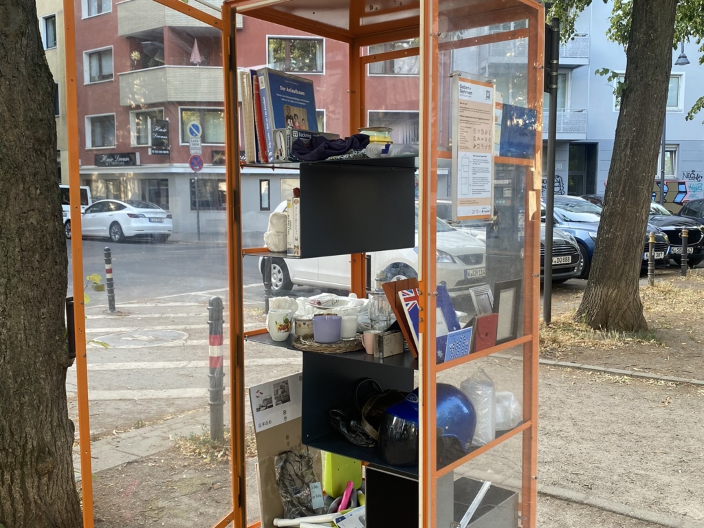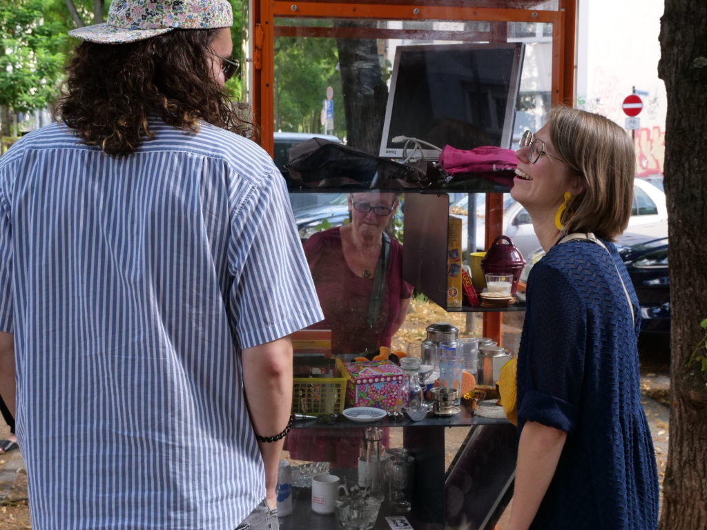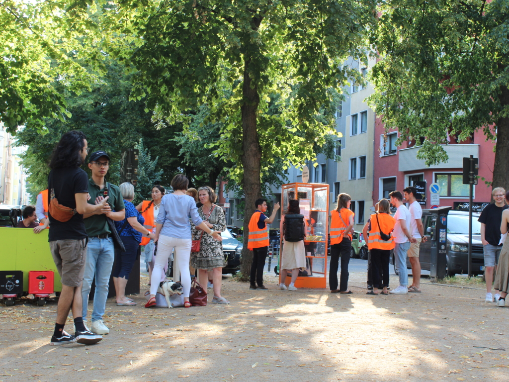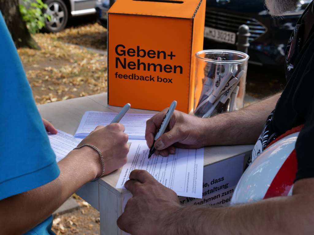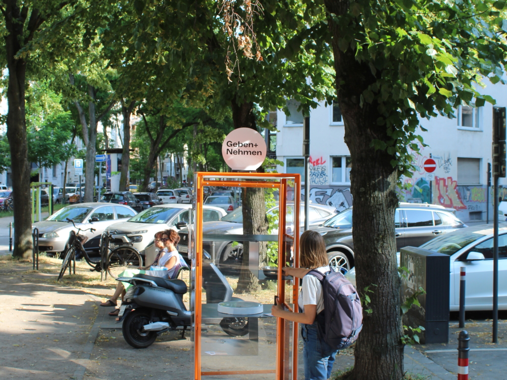 Daraufhin entwickelten die Studierenden das Tauschregal “Geben und Nehmen”. In diesem können Nachbar:innen Gebrauchsgegenstände, die sie nicht mehr benötigen, abstellen und Objekte, die sie gebrauchen, mitnehmen. Der Prototyp steht in der Testphase auf dem Eierplätzchen in der Kölner Südstadt und wird regelmäßig von der Nachbarschaft genutzt.