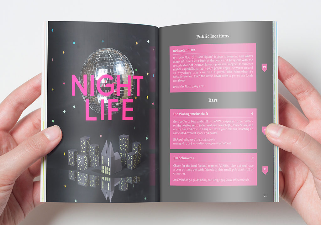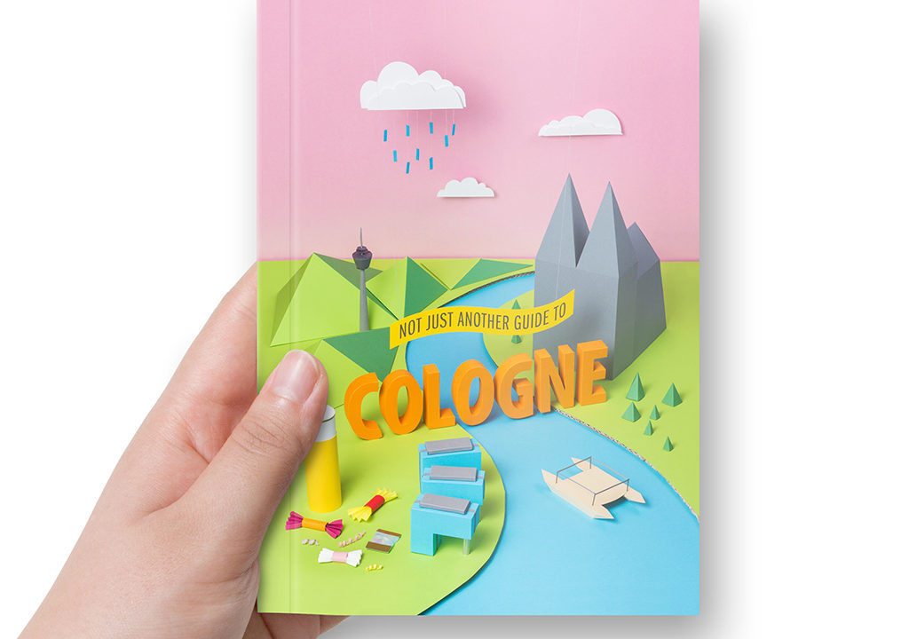 “It was important to us to create something that would not be left behind or forgotten in a drawer. We wanted this to be a souvenir that the students would love to take home and show to their friends and family.” says Yuki Fukuda. To make this happen, the visual concept took a different direction to that found in the ordinary tourist guide. Leaving the two dimensional, digital world, the team decided to visualise the cover, as well as the title pages for each of the twelve sections of the guide, with photographs of detailed scenes from Cologne constructed from coloured paper. These colourful paper models took about three hundred working hours to complete and, in the end, around a hundred meters of tape was used to fix 120 square meters of cardboard and paper together. The layout was kept visually simple and clean, to provide an easy-reading experience and to enable the reader to quickly take in the content.