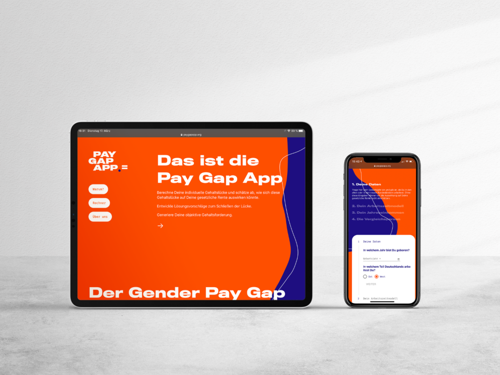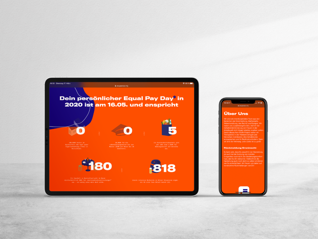 Durch die farbintensive Gestaltung und die ausdrucksstarken Grafiken in der Gender-Pay-App wird das Thema den Nutzerinnen und Nutzer prägnant dargestellt. Die Headlines weisen markant auf die wichtigsten Aussagen hin, und der mathematische Algorithmus wird durch das Aufgreifen eines klassischen Coding-Fonts dargestellt. Oberstes Ziel ist es dabei, sowohl Aufmerksamkeit zu erwecken als auch gesellschaftlichen Diskurs anzuregen. Dynamisch und laut – über alle Medien hinweg.