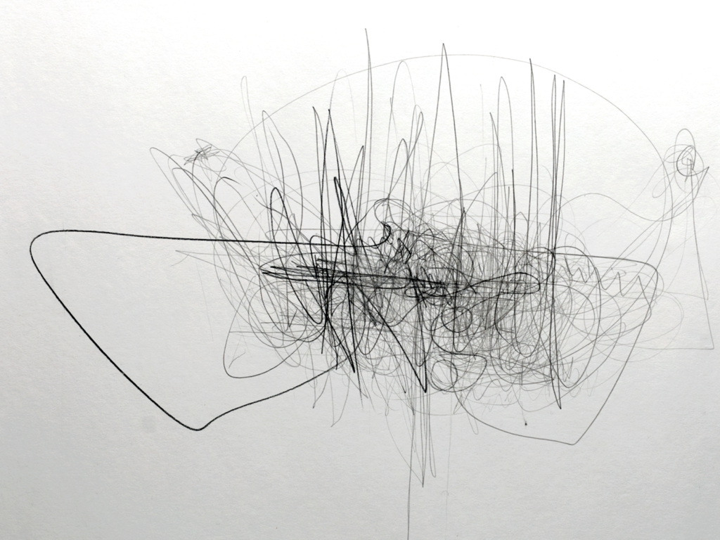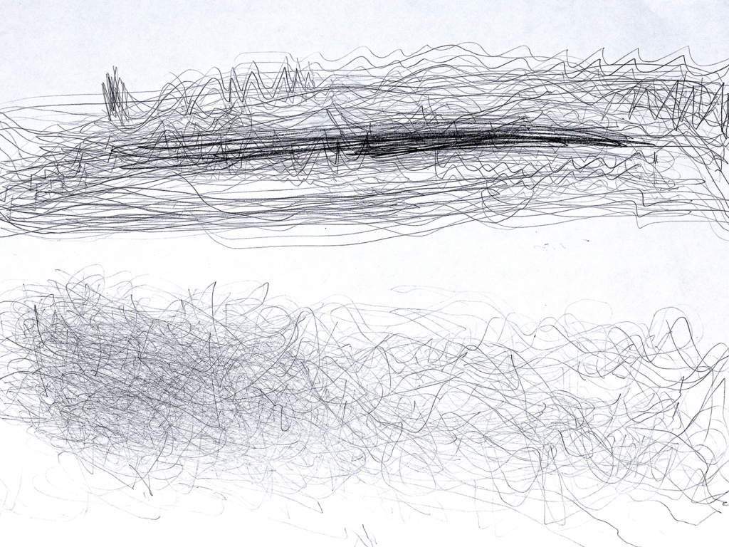 Die erste Experimentierreihe LIVE TRANSMISSION befasste sich mit der Praktik des performativen Zeichnens als Verfahren der Beobachtung und Erfassung von Handlungen im urbanen Raum. Gegenstand der zeichnerischen Handlungen waren Bewegungen und Geräusche von menschlichen wie nicht-menschlichen Akteur:innen bei einer alltäglichen Tätigkeit. Gezeichnet wird gleichzeitig mit mehreren Stiften in beiden Händen. Aus einer vibrierenden Unzahl von Linien formieren sich so in seismografischer Genauigkeit die Dynamik der beobachteten Aktionen auf dem Papier.