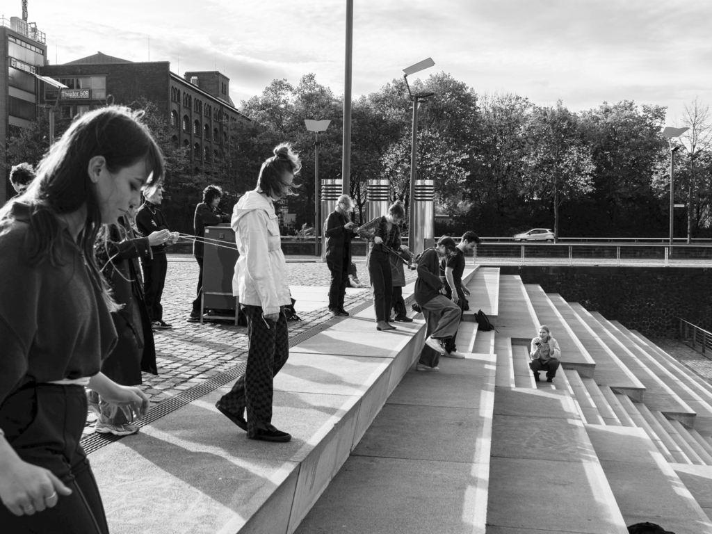 Die zweite Experimentierreihe WALK! setzte sich mit dem Akt des gemeinsamen Gehens als »ZuGang« zur Stadt auseinander. Als gestalterische Praxis bringt das kollektive Gehen die Idee eines urbanen Raums hervor, der erst in der Bewegung und Interaktion mit anderen entsteht und neben physischen Räumen auch mentale und virtuelle Räume miteinschließt. Das gemeinsame Gehen in verschiedenen Gangarten und Schrittmustern sensibilisiert für eine körperliche Umgebungserfahrung und eine nichtsprachliche Kommunikation der beteiligten Akteur:innen.