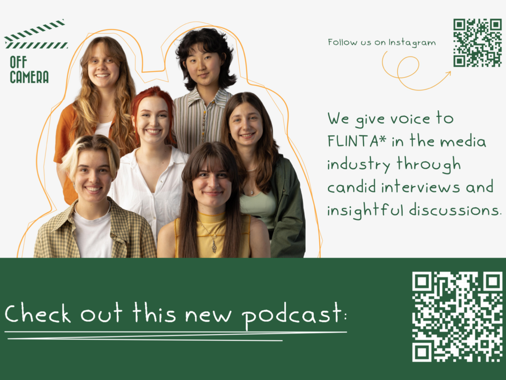 Im Rahmen des SIP (Self Initiated Project) „Off Camera: Dismantling Set Inequality“ haben die KISDies Mariia Kolkutova, Masha Kuzmina, Nicole Aschenbrenner, Renée Harth und Yibeige (Ruth) einen englischen Podcast entwickelt, der sich mit persönlichen Geschichten von FLINTA* in der Medienbranche beschäftigt. Durch offene Interviews und aufschlussreiche Diskussionen tauchten sie tief in die Erfahrungen, ihre Kämpfe und Erfolge ein. „Off Camera“ ist ein Kompass, der durch die dunkle Seite der Medien navigiert – von unerzählten Fakten bis hin zu vergessenen Geschichten und glorreichen Triumphen.