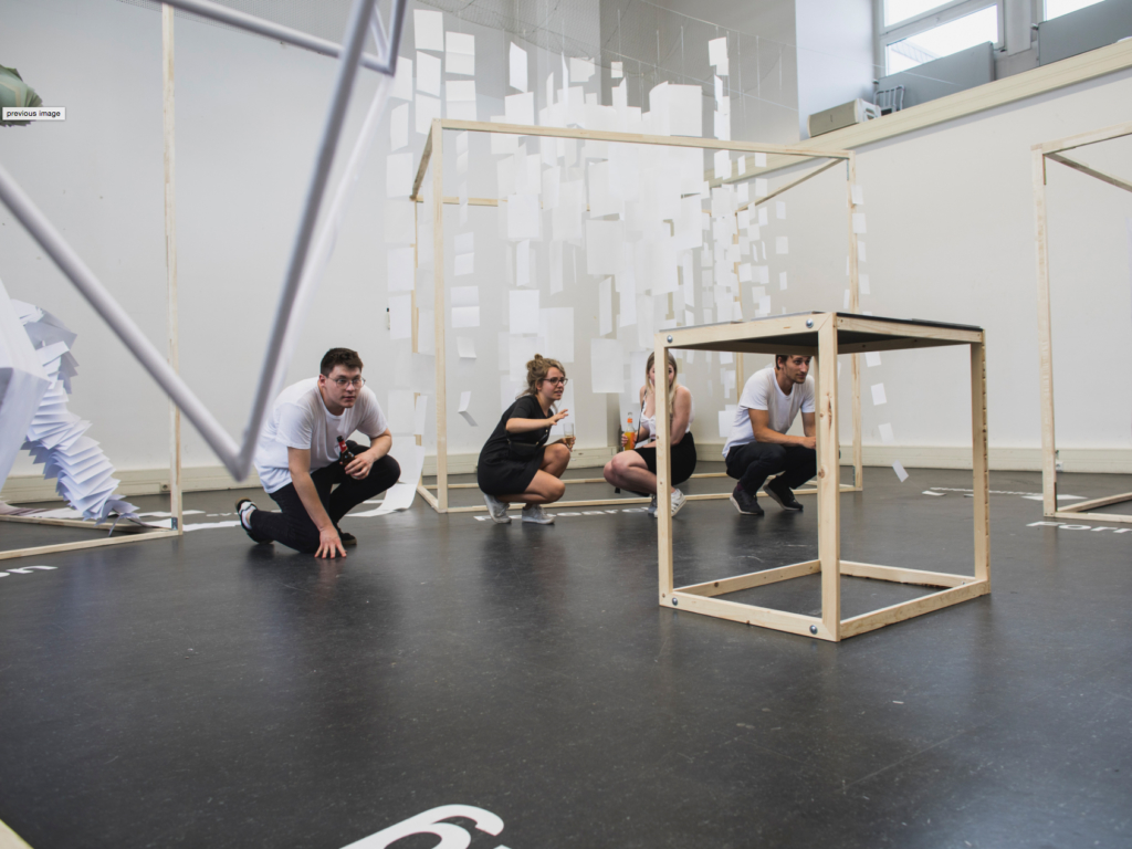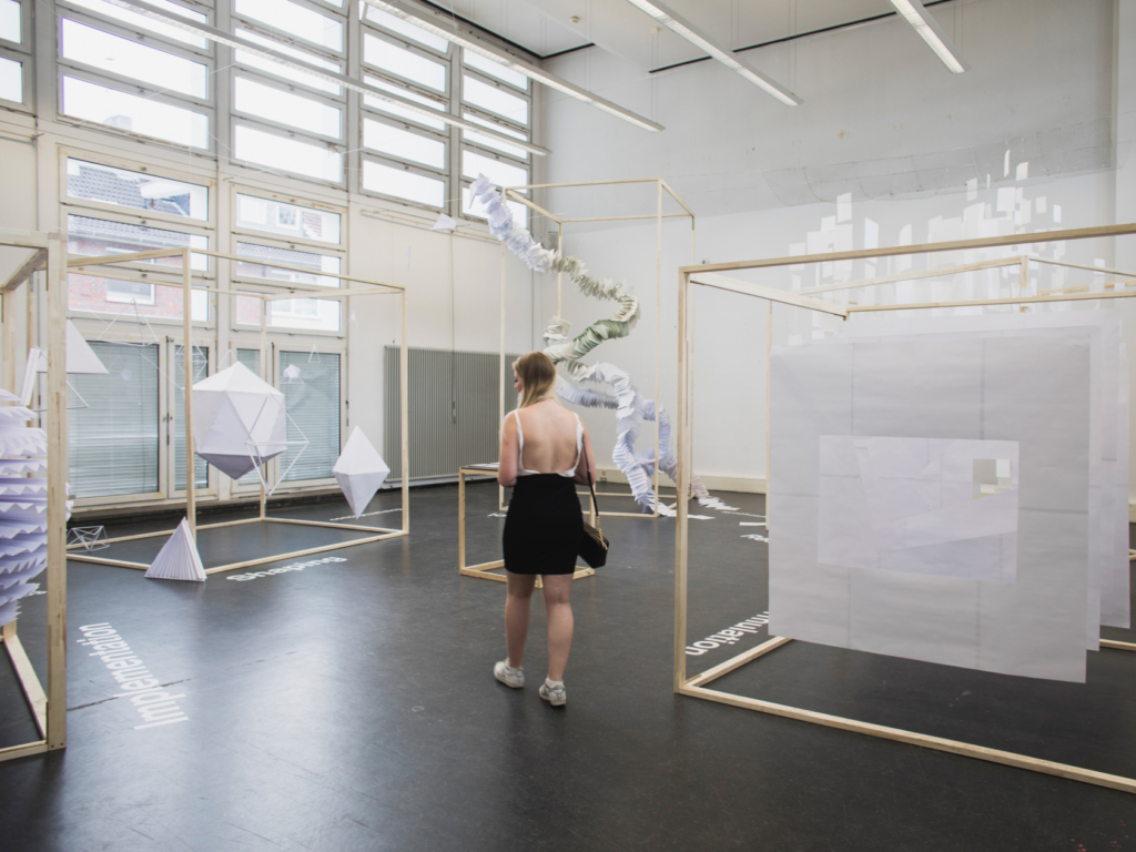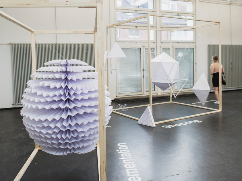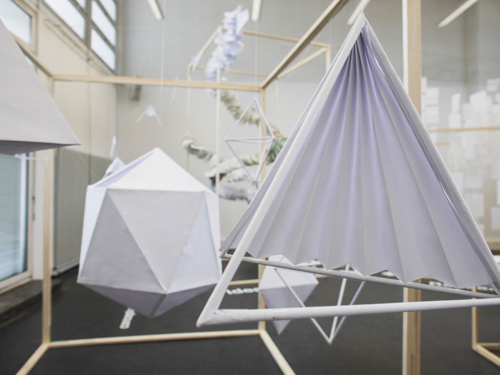 The project results, the processes and methods had to be envisioned in a spatial installation with the lowest possible costs and only with selected kinds of material: wooden slats and paper.