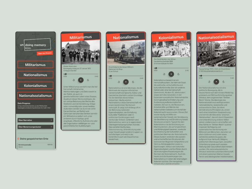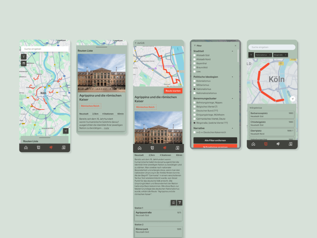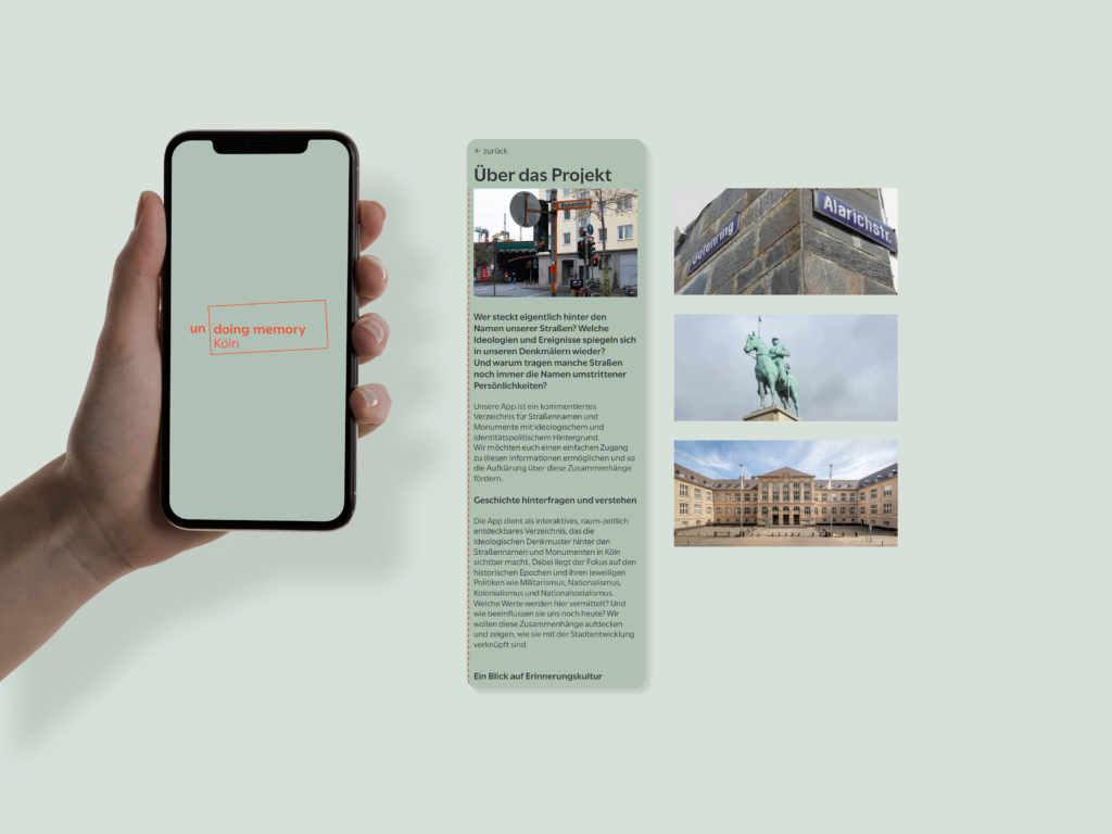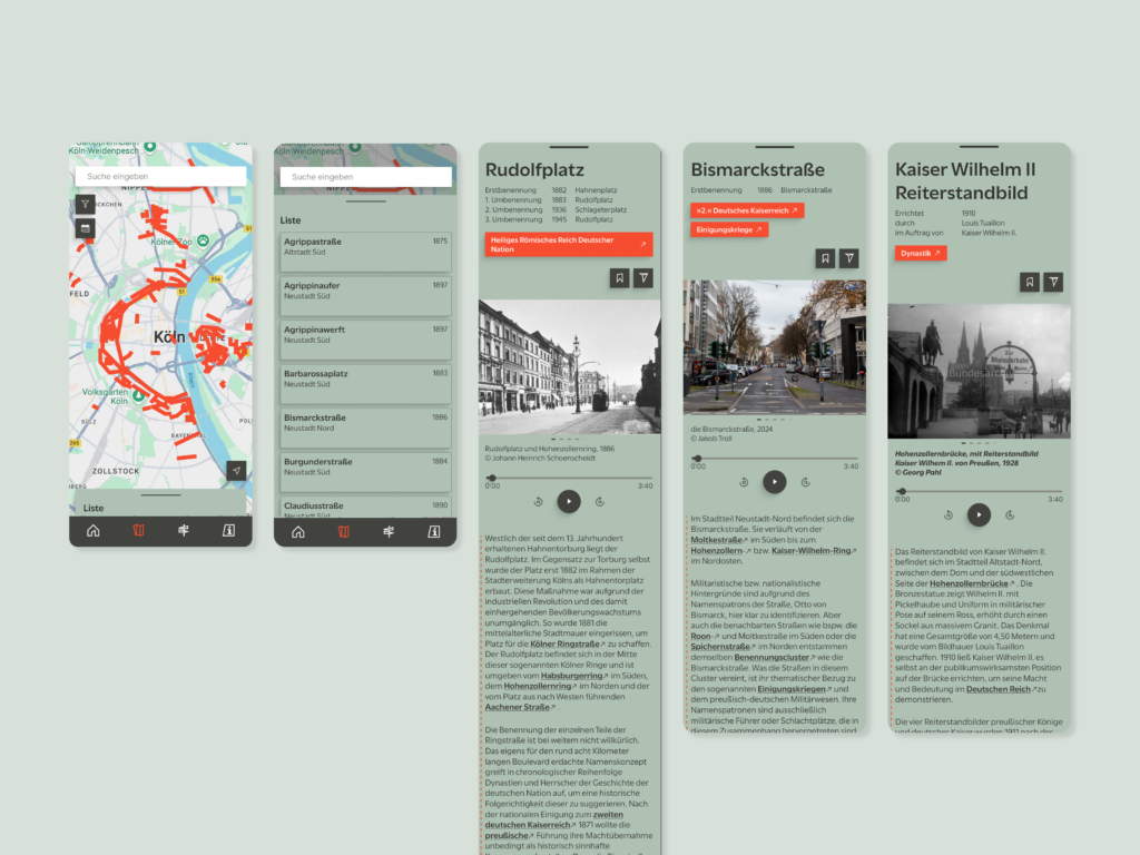 Entsprechende Ergebnisse wurden zunächst prototypisch und als Hypothese in Form eines digitalen Stadtrundgangs bzw. einer App aufbereitet. Diese verknüpft den analogen Stadtraum, Straßen- und Platznamen, historische Gebäude oder Denkmäler mit historischen Fakten. Die App richtet sich an ein breites und junges Publikum und bietet neben leicht zugänglichen Texten, historischem Bild- und Kartenmaterial und wissenschaftlichen Quellen auch Audiowalks, thematisch kuratierte Touren und weiterführende Links.
