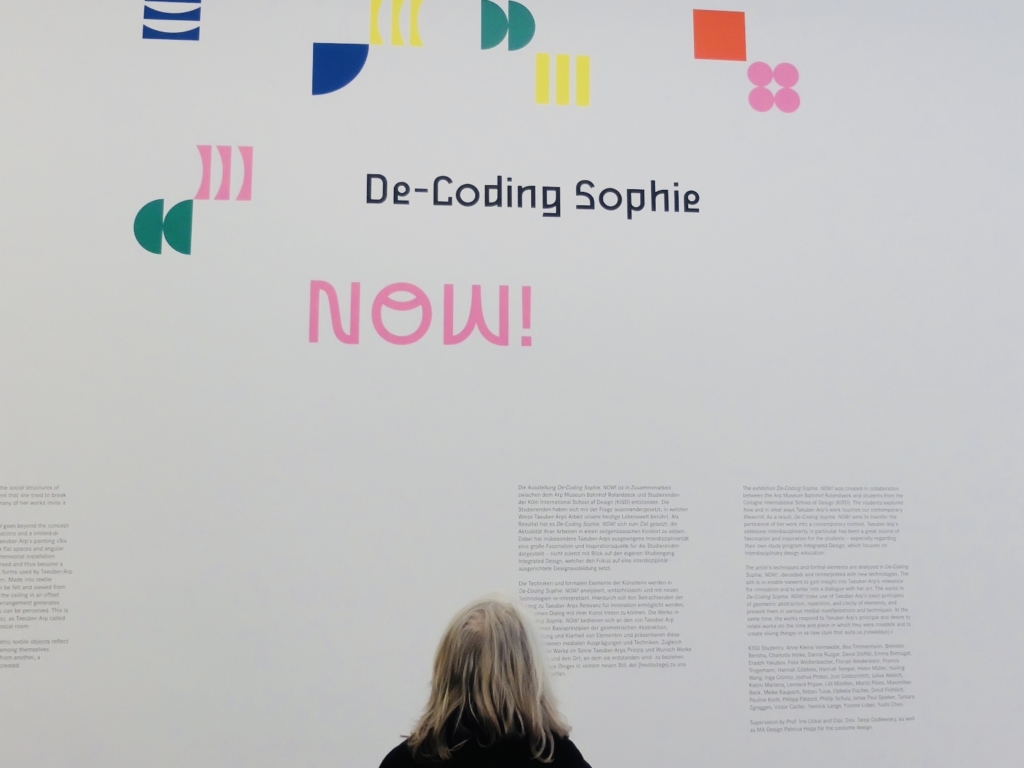 Taeuber-Arps Techniken und formalen Elemente werden in »De-Coding Sophie. NOW!« analysiert, „entschlüsselt“ und mit neuen Technologien re-interpretiert. Hierdurch soll den Betrachtenden der Zugang zu Taeuber-Arps Relevanz für Innovation ermöglicht werden, damit sie in Dialog mit ihrer Kunst treten können. Die Werke der KISD Studierenden in »De-Coding Sophie. NOW!« behandlen die von Taeuber-Arp verwendeten Basisprinzipien der geometrischen Abstraktion, Wiederholung und Klarheit von Elementen und präsentieren diese in verschiedenen medialen Ausprägungen sowieTechniken. Zugleich beziehen sie sich im Sinne von Taeuber-Arps Prinzip und Wunsch „auf die Zeit und den Ort, an dem sie entstanden sind“ und darauf, »lebendige Dinge« in »einem neuen Stil, der [heutzutage] zu uns passt« zu schaffen.