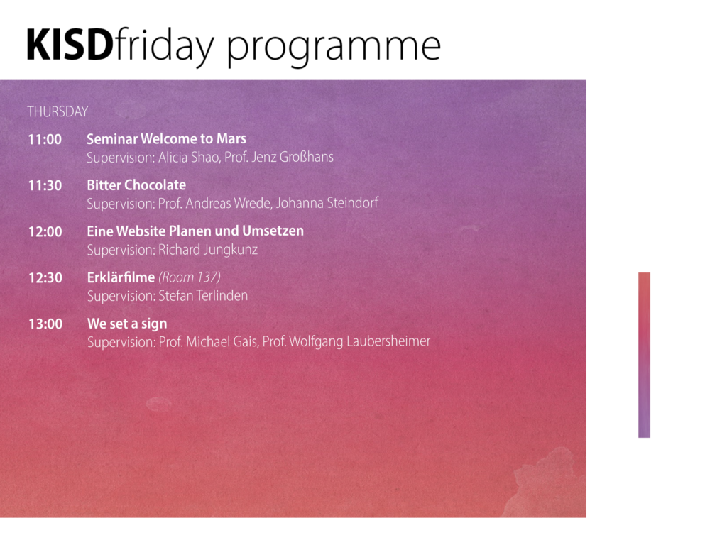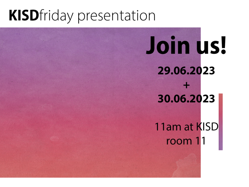 Join us for this semester’s last KISDfriday presentations, Thursday 29th June and Friday 30th June. The presentations are open not only to KISDies but to all who are interested. Join us. It’s gonna be great!