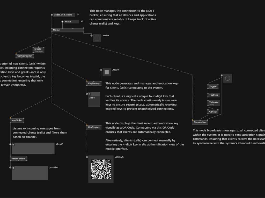In our daily work, we make heavy use of the visual programming environment “vvvv” as a conceptual grid in which our projects unfold. It enables us to visualize processes, model states, and embed feedback into the core of what we build. In setups involving motion, sound, light, interaction, and space, vvvv becomes a central real-time control unit. A core part of our studio toolkit is our set of custom libraries, modules, interfaces, and prototypes. It enables us to work efficiently while staying open to transformation: not everything has to be reinvented, but anything can be recombined.