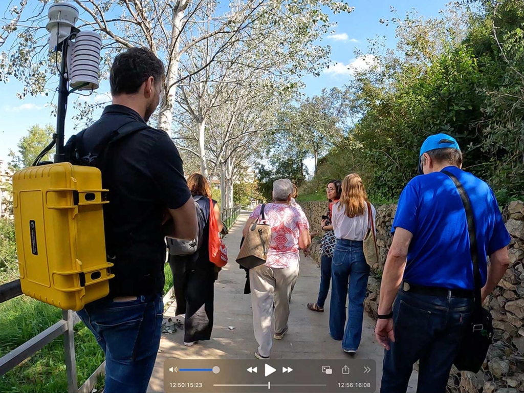 The Climate Journey Narratives group has developed a novel methodology for exploring and assessing the suitability of urban fabric and infrastructure for active mobility, such as walking, during warm and hot summer conditions. Using a videographic “walk-along” narrative combined with data-driven analysis, we can capture real-time climate data as experienced by the walker. A specially developed mobile weather station, worn as a backpack, records ten types of microclimatic data, each GPS-tagged and logged every five seconds. During the walk, we discuss our sensory experiences of the climate and the city — for example, whether we feel hot or whether there is a pleasant breeze. This conversation is recorded by a chest-mounted video camera. By comparing the two datasets, we gain insights into the climatic experiences of walkers, which help inform design strategies for cities.