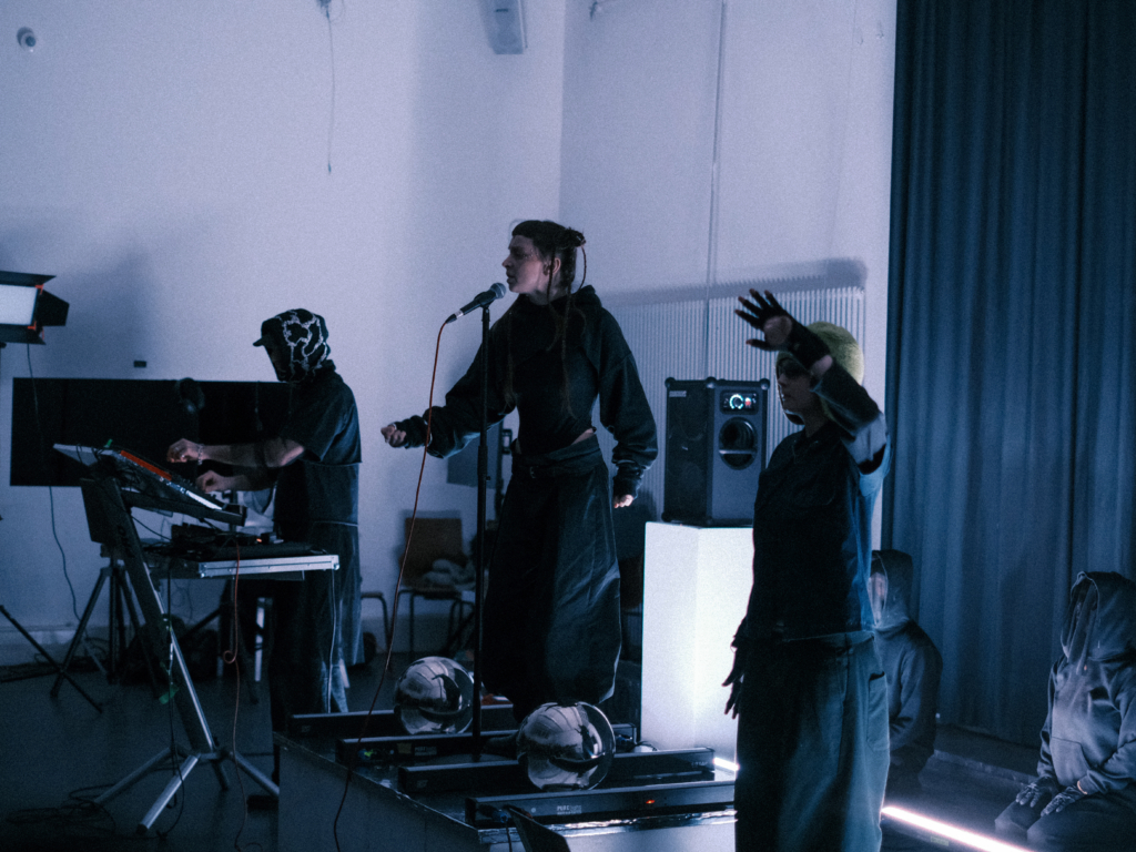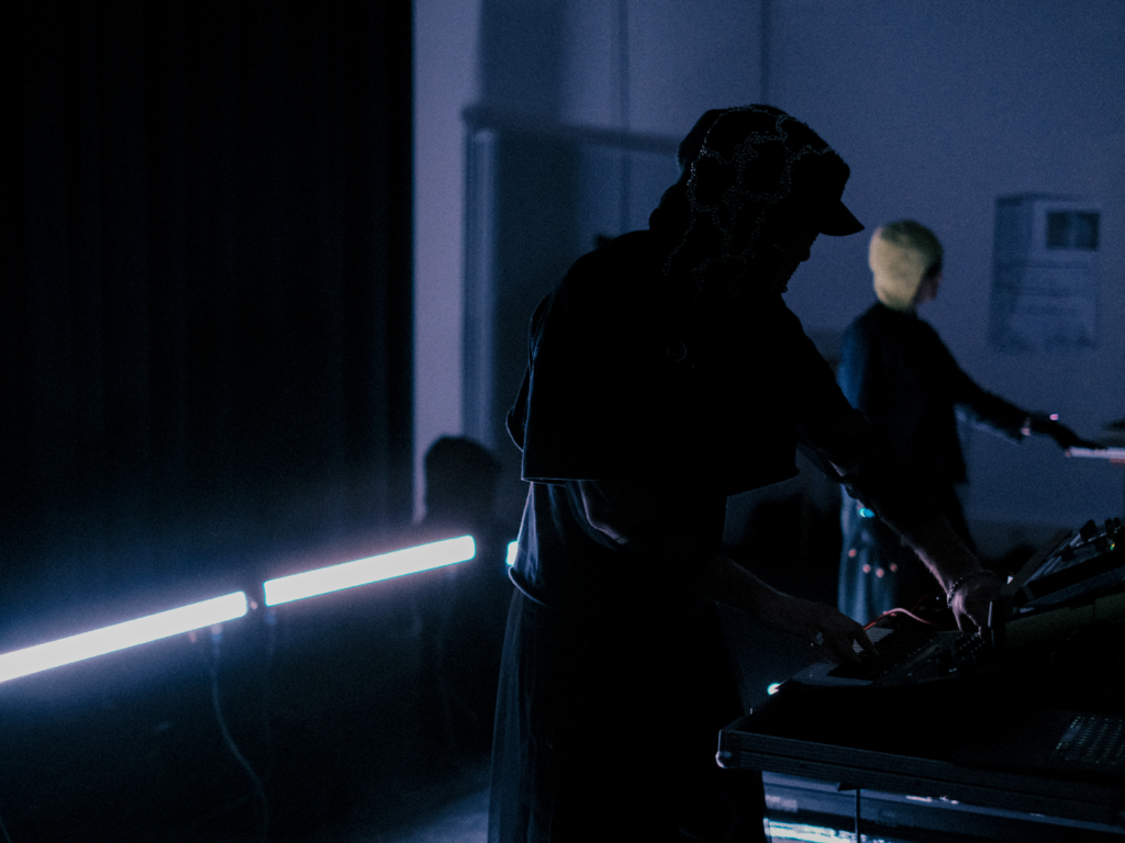 Die Proben sind Teil eines selbst initiierten Projekts unter der Betreuung von Prof. Nina Juric im Bereich /Image & Motion/. Sie sind als offene Arbeitssessions konzipiert und dienen gezielt dem Testen, der Rückmeldung sowie der kontinuierlichen Weiterentwicklung der finalen audio-visuellen Arbeit. In diesem iterativen Prozess wird die Licht- & Sound-Performance auf ihren Auftritt am 23. Januar in der Berghain Kantine in Berlin vorbereitet, der in Zusammenarbeit mit dem bekannten Künstler Moritz Simon Geist im Rahmen seines Eventformats *HUMAN INPUT* stattfindet.