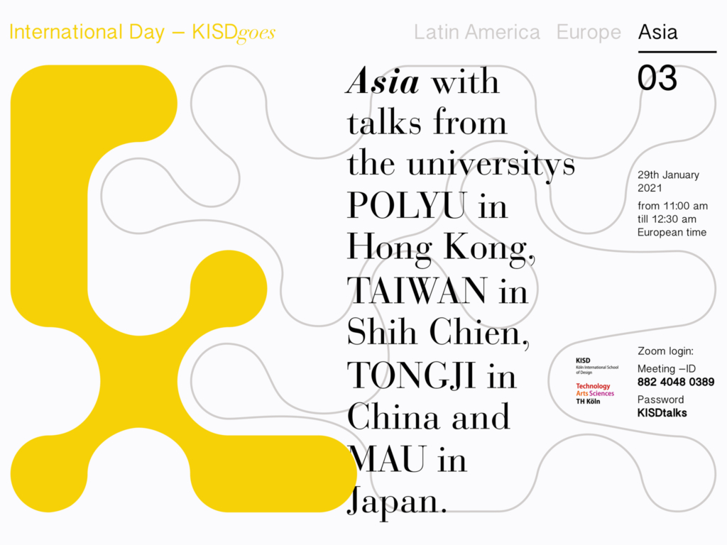 Due to the Coronavirus pandemic, possibilities for travelling around the globe and welcoming domestic and international guest speakers are, unfortunately, quite limited. Nonetheless, KISDinternational will be hosting some online lectures in the context of our lecture series of the KISDtalks in which some of our partner universities will be given the chance to present themselves and their study opportunities. On Friday, January 29, 11 am, KISD – Köln International School of Design “goes Asia”. We will virtually travel around Asia, in particular Japan, Taiwan, and China, and get to know the following of our partner institutions and their design programs open for exchange: Tongji University, Shanghai, Hong Kong Polytecnic University, Hong Kong, Musashino Art University, Tokyo, and Shih Chien University, Taipei, Taiwan. The following speakers, together with some international students, will be at your disposal for presentations of their respective design programs.
