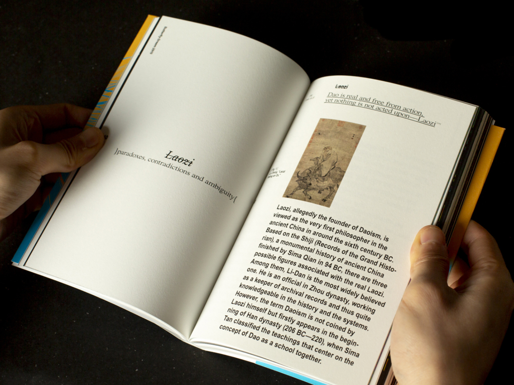 The visual style associated with Daoism has always been leaning toward being simplistic and minimalist, commonly translating the founder Laozi’s claim of »Nothingness« into visual emptiness and the neglect of concrete forms. However, instead of the simplistic and harmonic looking result, the project seeks a more unprocessed way to approach Daoism. By a deep reflection on the philosophy, the project does not intend to make a visual paraphrase of what the philosophers say but focuses on the paradoxical and metaphorical language they use and utilizes graphic design as a form of articulation.