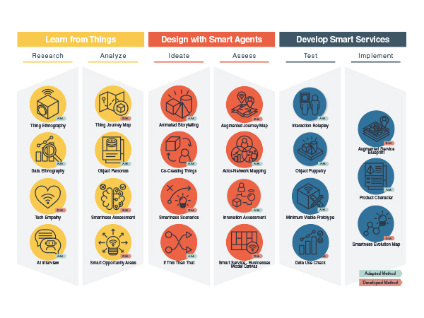 While the Internet of Things is positioned to be one of the defining technological industries of the coming years, concern has been growing about an upcoming coming wave of products perceived as useless, as a result of a marked technological push. The following project draws on Actor-Network Theory and the emerging agency of smart objects for exploring new perspectives for the design of Smart Services, with a strong focus on the generation of meaningful offerings. Through a research approach based on an in-depth literature review together with the exploration of current design practice, a framework is proposed for the design process of such services. The developed framework, comprised of a process structure, a mindset and a set of methods, was then validated through the use in an academic service design project at the Köln International School of Design (KISD). A revised version was used as the basis for the publication of the website Smart Service Design (.com), a platform for the exchange of knowledge around the topic.